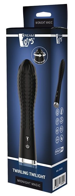 TWIRLING TWILIGHT - это вибратор с ромбовидным узором для дополнительной стимуляции. Он изготовлен из силикона и перезаряжается от USB-провода. Мотор имеет 3 уровня вибрации и 9 различных ритмов. Вращающиеся шарики в верхней части обеспечивают дополнительную стимуляцию.