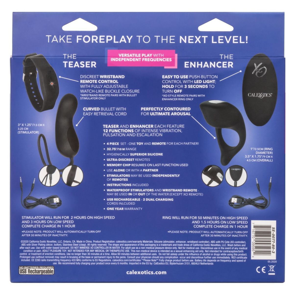 Silicone Remote Foreplay Set - набор для двоих, состоящий из компактного вибромассажера с управлением при помощи браслета и эрекционного виброкольца с управлением при помощи пульта. Перезарежаемый компактный вибромассажер с дистанционным управлением при помощи пульта в виде браслета и перезаряжаемое эрекционное кольцо с дистанционным управлением при помощи пульта изготовлены из гигиеничного, ультрамягкого, не содержащего фталаты силикона высшего качества, обеспечивающего удивительно приятную и гарантированно безопасную стимуляцию. Мощный мотор вибромассажеров обеспечивает 12 функций равномерной глубокой вибрации. Вибромассажеры снабжены высокотехнологичным чипом памяти, который позволяет запомнить последний режим выбранной вибрации и включается именно с него, не требуя снова искать предпочитаемую функцию. Обтекающая слегка изогнутая форма вибратора делает его идеальным как для внешней, так и для внутренней стимуляции. Можно использовать как стимулятор в трусики. Удобная петелька позволит легко извлечь тренажер при необходимости в любой момент. Эрекционное кольцо препятствует оттоку крови для поддержания эрекции и замедляя процесс эякуляции. Оно имеет уникальную ребристую форму обеспечивающую дополнительную стимуляцию клитора или яичек во время полового акта. Бархатистая поверхность обеспечит максимально нежные тактильные ощущения. Управление эрекционного кольца осуществляется с помощью пульта. Радиус действия 10 метров. Для активации/дезактивации нажмите кнопку на стимуляторе и удерживайте 3 секунды, пока не появится красный мигающий огонек. На пульте так же нажимаем «XO» и удерживаем до того момента, как появиться вибрация на стимуляторе. Игрушка может быть использована как вместе с пультом, так и сама по себе. Управление вибромассажера осуществляется с помощью браслета. Радиус действия 10 метров. Для активации/дезактивации нажмите кнопку на стимуляторе и удерживайте 3 секунды, пока не появится красный мигающий огонек. На браслете так же нажимаем кнопку включения и удерживаем до того момента, как появиться вибрация. Игрушка может быть использована как вместе с пультом, так и сама по себе. Заряжаются вибростимуляторы через специальный аккумуляторный USB-кабель и могут быть подключены практически в любом месте. Просто подсоедините идущий в комплекте шнур к изделию и совместимому порту компьютера или USB-адаптера (приобретается отдельно). Полная зарядка вибростимуляторов занимает 60 минут, ее достаточно для беспрерывной работы вибромассажера до 180 минут низкоскоростной вибрации или 120 минут высокоинтенсивной стимуляции и эрекционного кольца от 55 до 90 минут вибростимуляции. Длина массажера - 7,5 см., диаметр - 3,25 см. Длина эрекционного кольца - 9 см., внешний диаметр - 4,5 см., внутренний - 2,5 см.