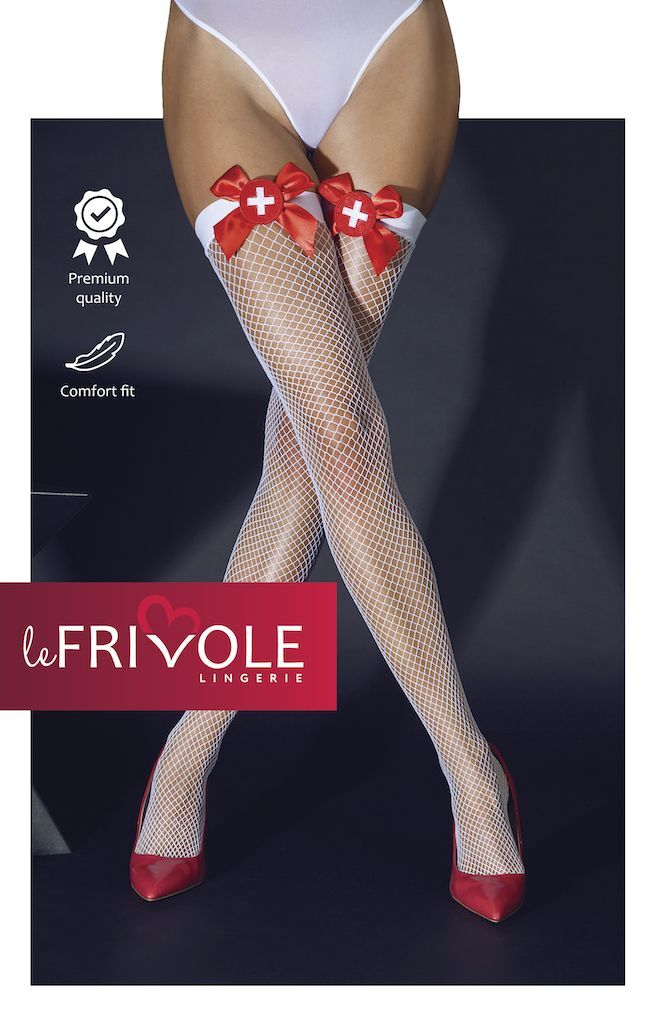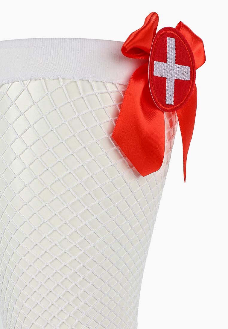 Чулки медсестры в сетку с бантиками. Белые чулки помогут создать образ озорной медсестры. Изделие украшено красными бантами, что делает их еще более игривыми. Плотность - 20 ден.
