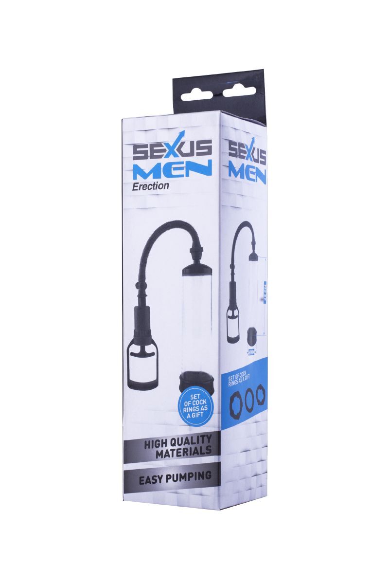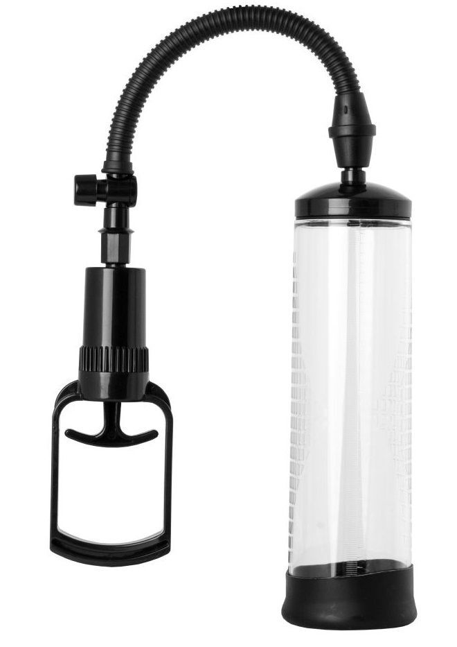 Чёрная вакуумная помпа с прозрачной колбой. С мягким уплотнителем на входе. Набор из 3 эрекционных колец разного диаметра в качестве бонуса.