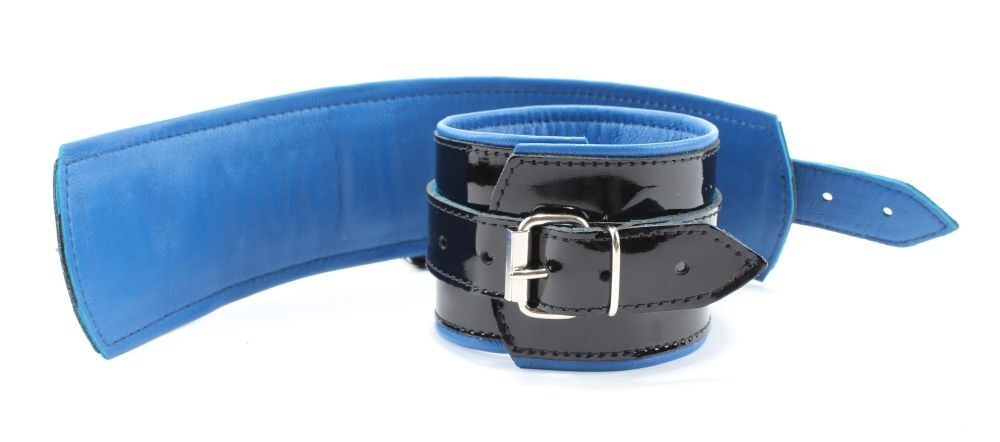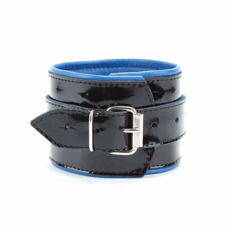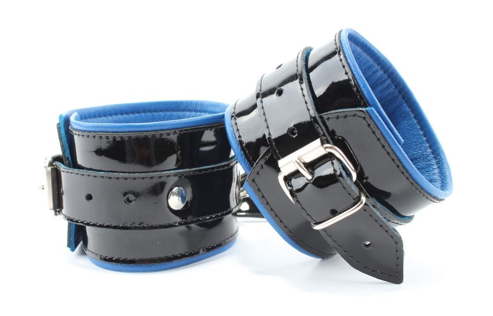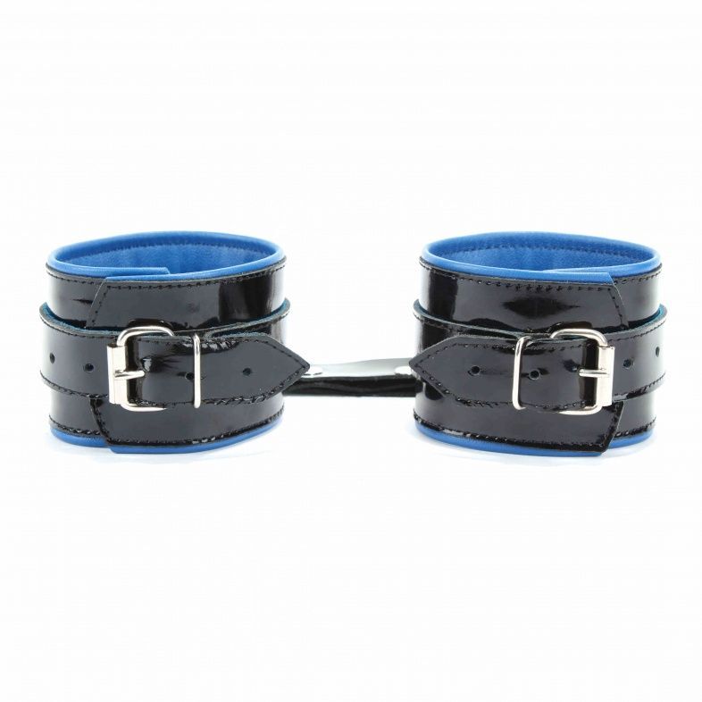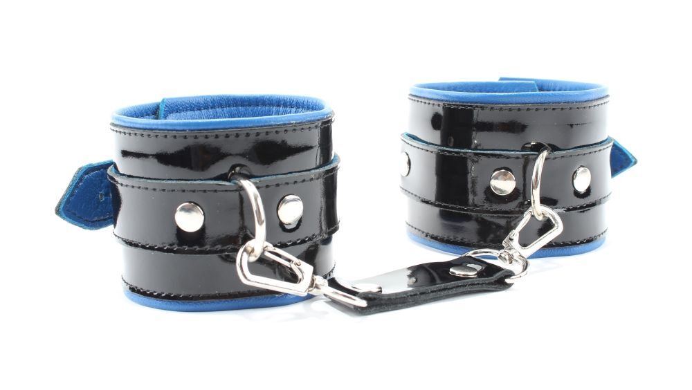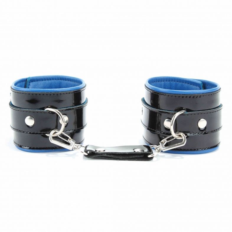 Наручники выполнены из черной натуральной лакированной кожи. Подклад изделия из синей перчаточной кожи. Аксессуар декорирован металлическими заклёпками. Наручники надежно фиксируются пряжками и ремнями, позволяющими выбрать нужный размер, подойдут на обхват руки от 16 до 26 см. Кожаное соединение на карабинах фиксирует наручники вместе. На каждом аксессуаре два полукольца из сварной фурнитуры. Стильные наручники помогу воплотить эротические фантазии в реальность. Ширина - 6 см. Длина соединения - 14 см.