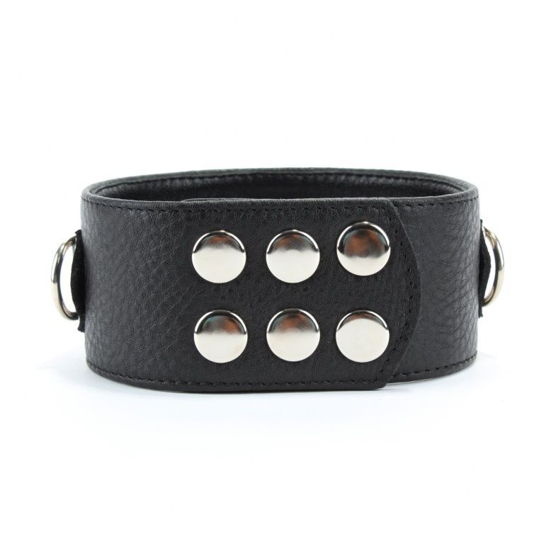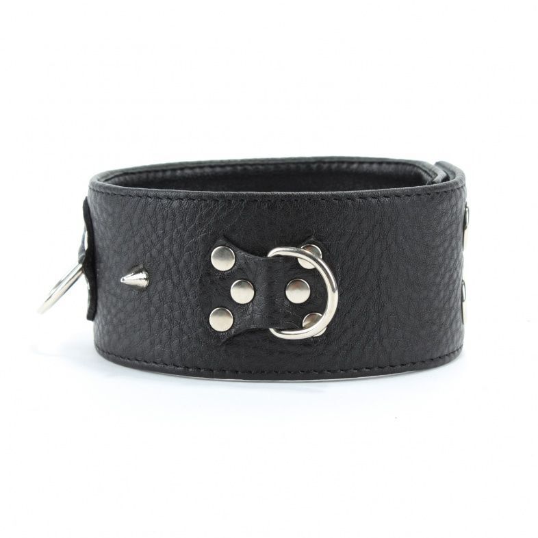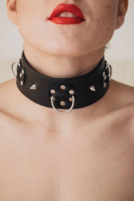 Ошейник выполнен из натуральной кожи черного цвета, декорирован шипами. На изделии находятся три сварных полукольца. Аксессуар декорирован металлическими заклепками. Ошейник фиксируется металлическими кнопками, позволяющими подобрать нужный размер, подойдет на обхват от 32 до 37см. Стильный аксессуар поможет воплотить эротические фантазии в реальность. Ширина - 5 см.