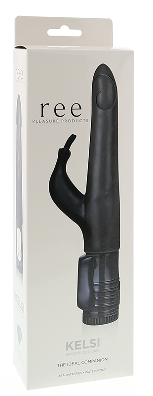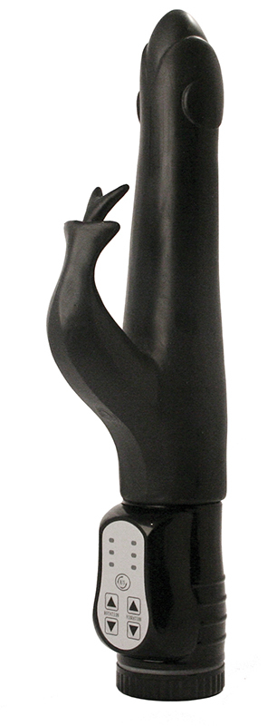 Чёрный вибратор с клиторальным стимулятором Kelsi. Головка вращается в двух направлениях.