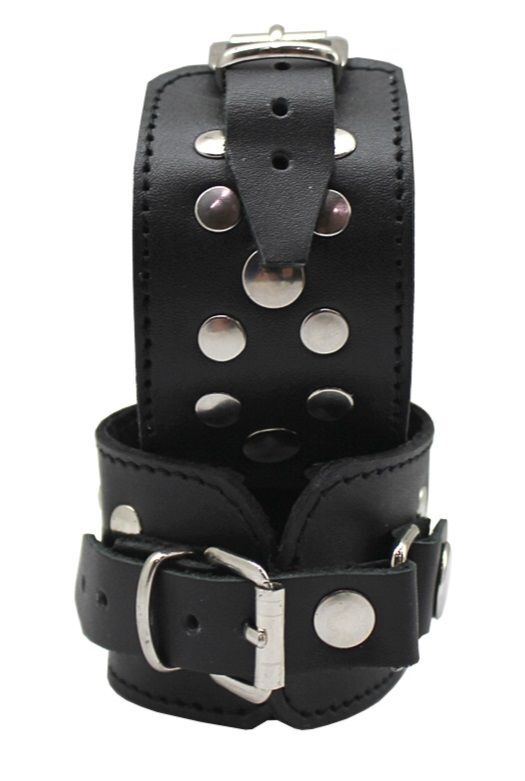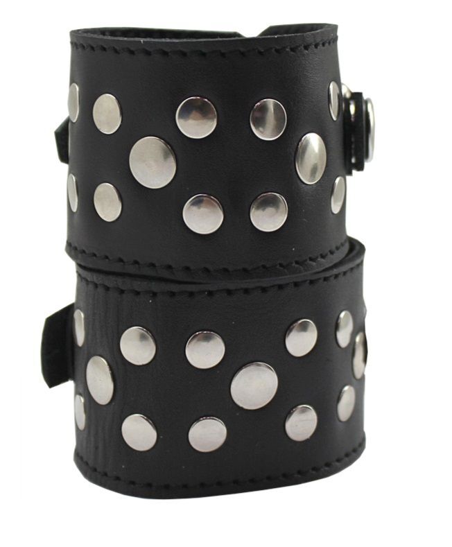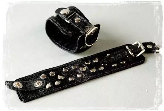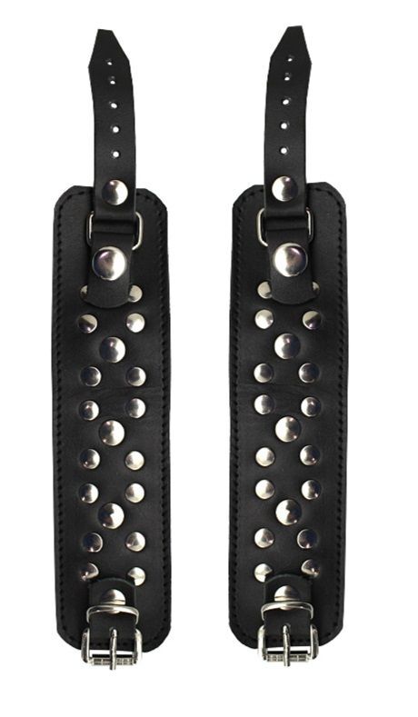 Наручники узкие, декорированные заклепками. Размер наручников регулируется застежкой пряжкой. Можно носить как декоративные браслеты. Выполнены из натуральной кожи черного цвета.