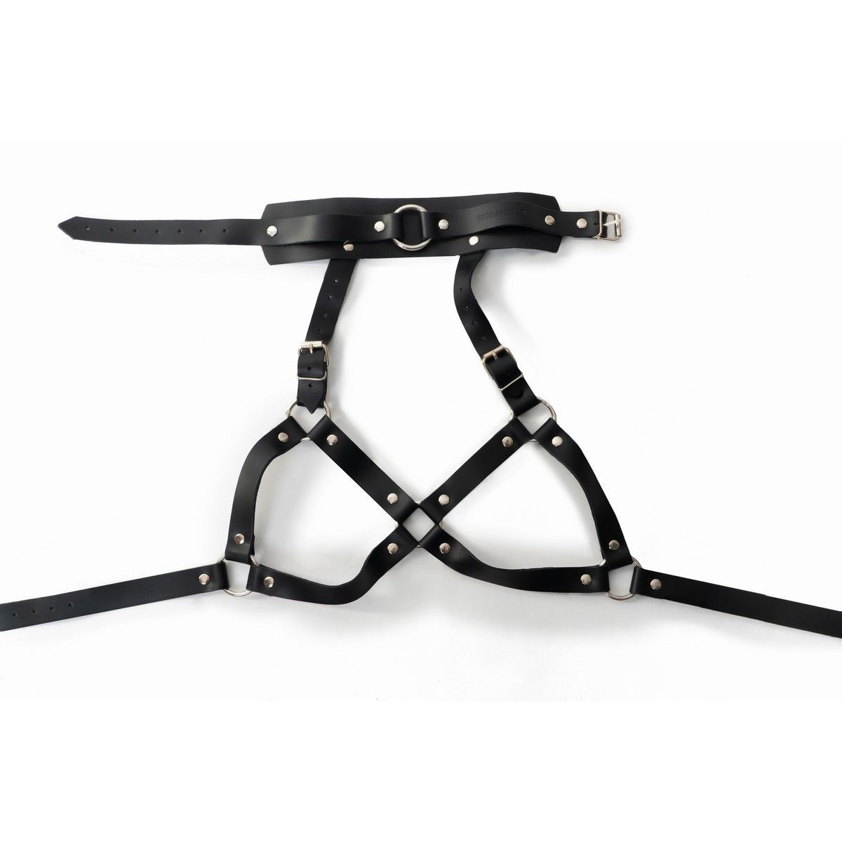 Эффектный аксессуар для создания яркого образа. Сбруя из натуральной кожи. Фиксируется на теле индивидуально под ваш размер с помощью ремешков. Может надеваться как на обнаженное тело, так и в качестве украшения на белье или рубашку. В основании ошейника находится кольцо для фиксации поводка или любого другого аксессуара. Размер универсальный - от 42 до 46. Ширина ошейника - 4 см. Ширина ремешков - 2 см.