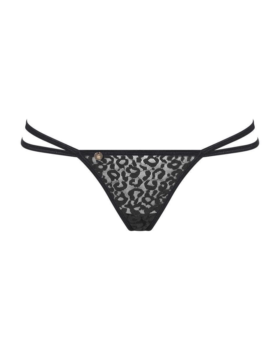 Соблазнительные трусики-стринг из коллекции Pantheria из вуали с анималистичным принтом, спинка открыта, украшена съёмными цепочками.