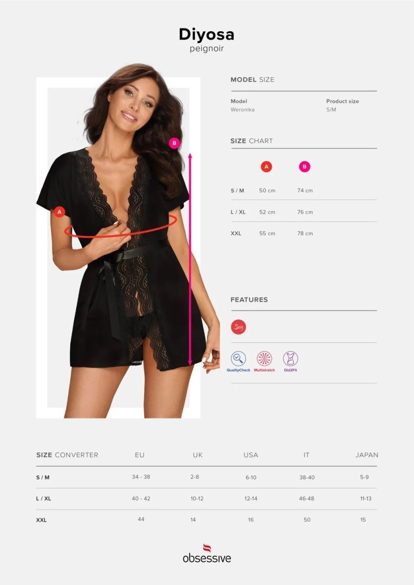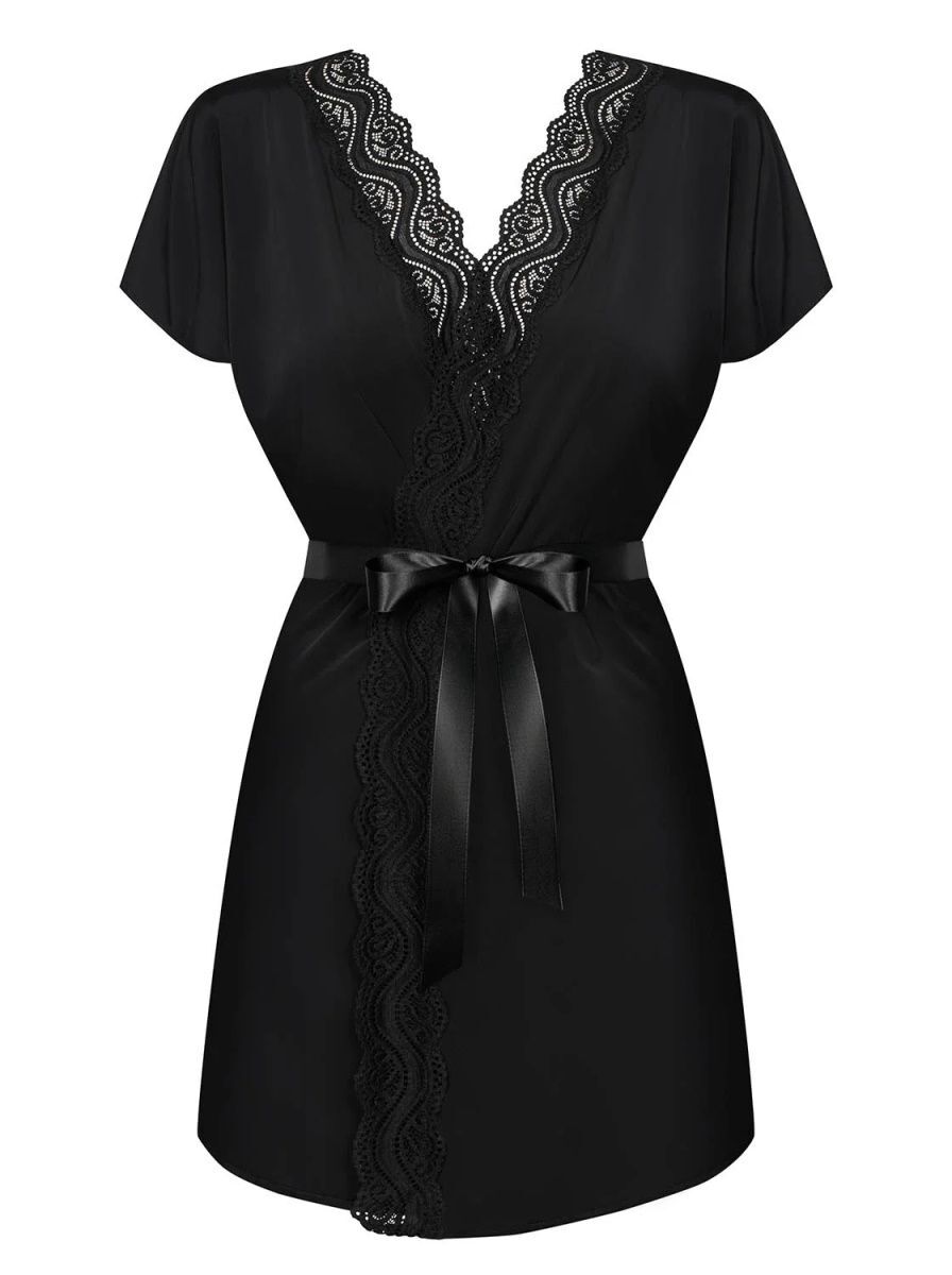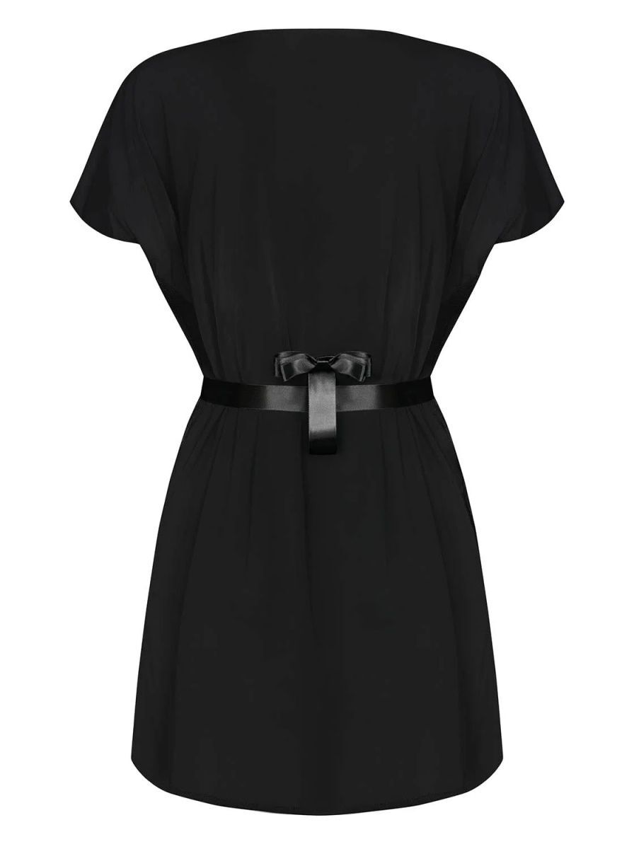 Короткий пеньюар из эластичной облегающей ткани. Украшен узорчатым кружевом по краю и на боках. Пеньюар завязывается на талии при помощи глянцевого атласного пояса. Кокетливый сатиновый бантик на спинке добавляет модели изюминку.