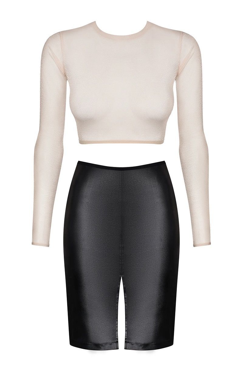 Эффектный костюм босса состоит из двух частей. Укороченная блуза облегающего кроя с оригинальным вырезом на спине и с длинными рукавами. Юбка из эластичного материала, имитирующего кожу, спереди глубокий разрез, сзади декоративная молния. В комплекте: блуза, юбка.