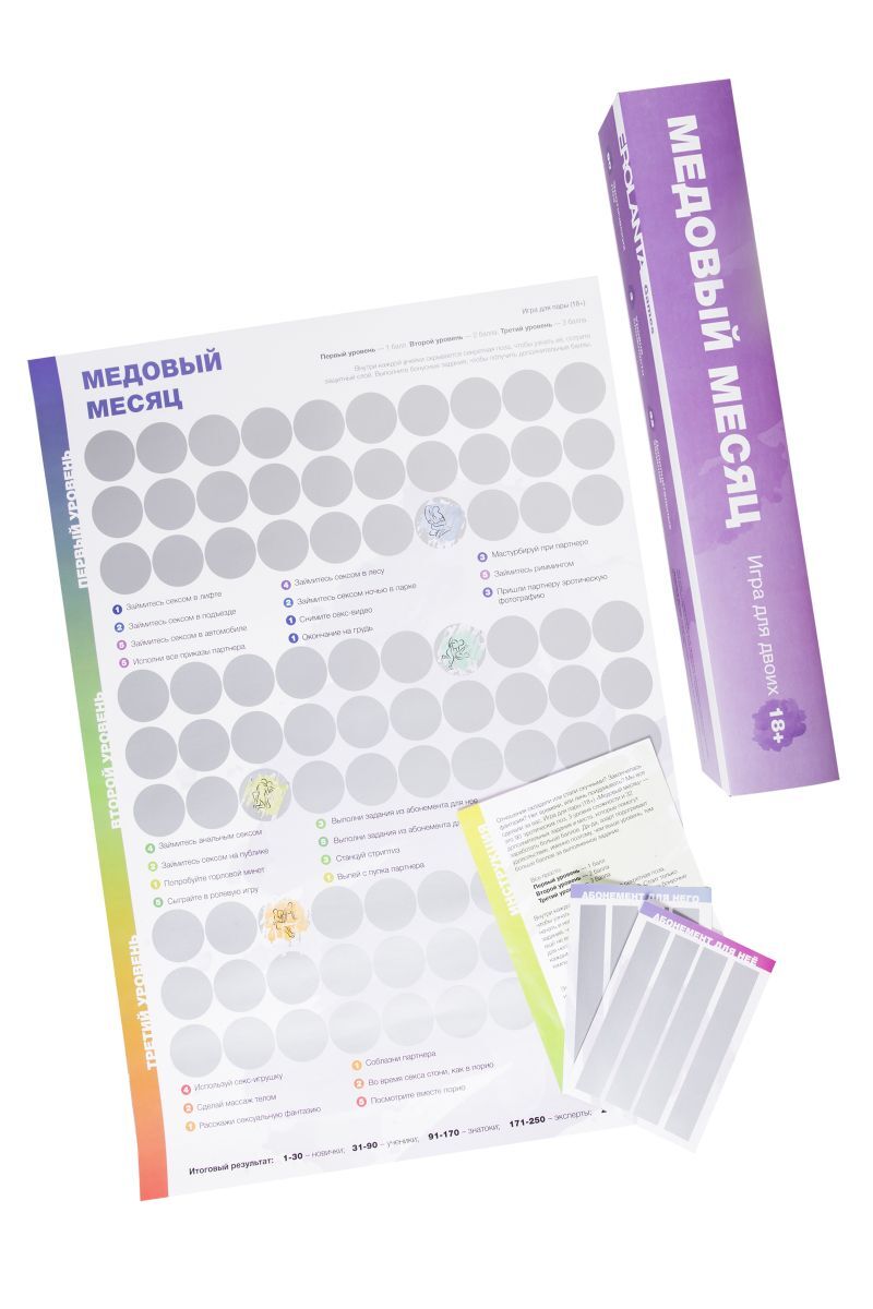Эротическая игра для двоих (18+) “Медовый месяц” – настоящая карта-путеводитель в сексуальных приключениях! Такая игра гарантированно разнообразит интимную жизнь в паре. Карта не только разжигает страсть, но и становится своеобразным учебным пособием, а как известно – учиться в игровой форме намного эффективнее и приятнее. Специальный скретч-плакат содержит 90 эротических поз, 3 уровня сложности и 32 бонусных задания. Выполняйте задания и набирайте максимальное количество баллов, чтобы пройти путь от новичков к профессионалам. Азартная игра позволяет каждому участнику открывать для себя новые грани удовольствий и демонстрировать способности. Игра способна пощекотать нервы, ведь все позы скрыты защитным слоем, а общий результат зависит от вклада каждого участника. Если считаете себя продвинутым игроком, начинайте сразу с третьего уровня. Или продвигайтесь по карте постепенно, создавая свой неповторимый индивидуальный путь. Медовый месяц – это сексуально-позитивная игра, улучшающая микроклимат внутри пары и вызывающая положительные эмоции. Для игры не имеет значение возраст партнеров и стаж отношений. Игровой формат продвигает отношения в паре на новый уровень, освежает длительные отношения и помогает весело проводить время наедине. Игра Медовый месяц для тех, кто хочет: попробовать новые виды взаимных ласк освежить длительные отношения узнать партнера с новой стороны экспериментов и разнообразия улучшить качество интимных отношений. Внутри: игра-плакат А2, инструкция-договор согласия А5, абонемент для нее А6, абонемент для него А6. Медовый месяц станет отличным подарком на день рождения, свадьбу, годовщину, 14 февраля, 23 февраля и 8 марта, новый год, девичник и мальчишник. В комплекте: игра-плакат формата А2, инструкция-договор согласия формата А5, абонемент для нее формата А6, абонемент для него формата А6.