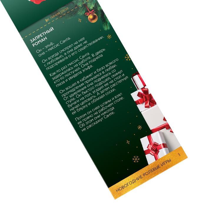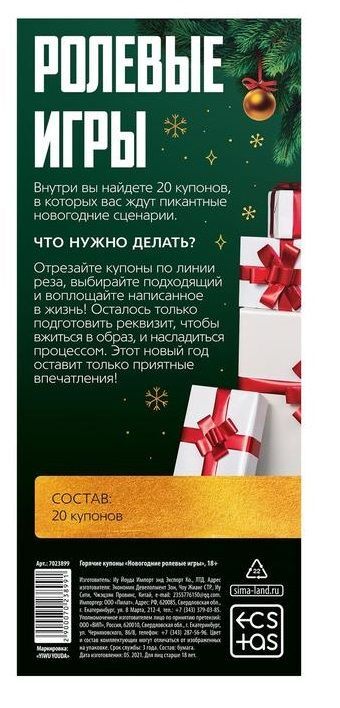 Внутри вы найдёте 20 купонов, в которых вас ждут пикантные новогодние сценарии. Отрезайте купоны по линии реза, выбирайте подходящий и воплощайте написанное в жизнь! Осталось только подготовить реквизит, чтобы вжиться в образ, и насладиться процессом. Этот Новый год оставит только приятные впечатления! В комплекте: 20 купонов.