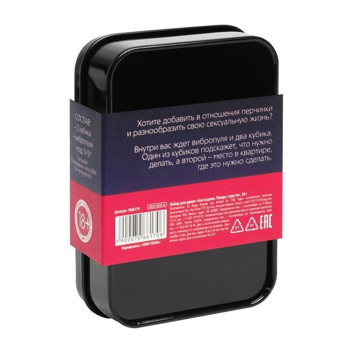 Узнайте все секреты наслаждения! Представляем вам серию премиальных эротических игр в жестяных коробочках. Хотите добавить в отношения перчинки и разнообразить сексуальную жизнь? Тогда этот набор - то, что вам нужно. Внутри вас ждут пикантные атрибуты для секс-игр: вибропуля и неоновые кубики. Как пользоваться кубиками? Очень просто! Всего в комплекте их два: один подскажет, что нужно сделать со своим партнёром, а второй — место, где нужно это сделать. Что делать с другим аксессуаром? Да всё, что угодно, лишь бы это приносило вам удовольствие! В комплекте: 2 неоновых кубика, вибропуля.