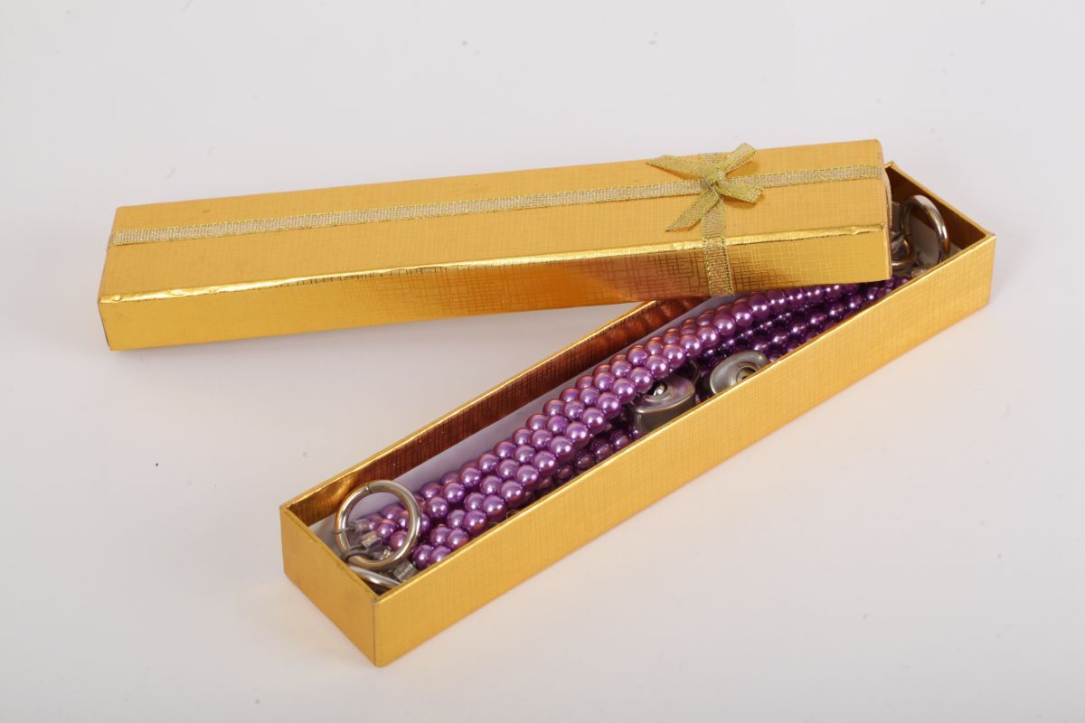 Красивые наножники из фиолетового жемчуга с замочками в виде сердца и четырьмя ключиками. Чтобы ограничивать движения есть небольшая цепочка с двумя карабинами. Упаковка - картонная золотая коробка с бантиком. Длина соединительной цепочки - 13 см. Длина браслетов - 26 см., ширина - 2,5 см.