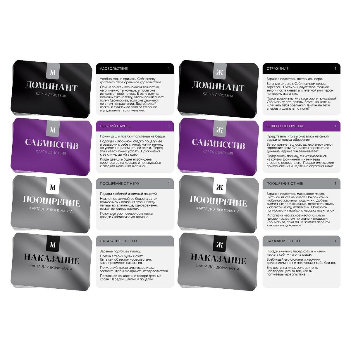 Только ты и я… Откройте свои желания… Под покровом ночи вы останетесь совершенно одни. Сделайте всё, чтобы ваш партнер получил неземное удовольствие. А поможет вам в этом невероятно возбуждающая игра для двоих. Тайна, которая останется между вами. Одному из вас достанется роль доминанта, а второй будет сабмиссивом. Вытягивайте карточки из своей колоды и воплощайте в реальность сценарии соблазнения. В любой момент доминант сможет начать активные действия - поощрения или наказания. Играйте и дарите друг другу удовольствие! В комплекте: 50 карт, правила, перо.