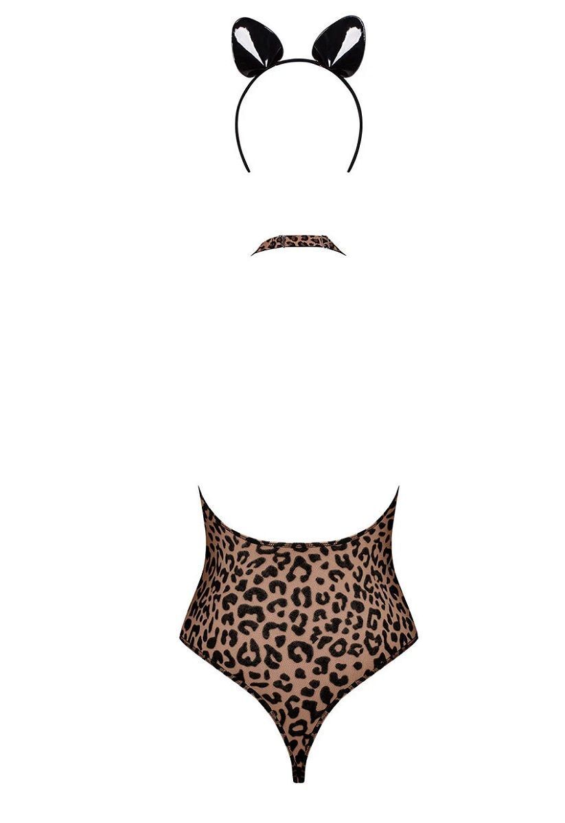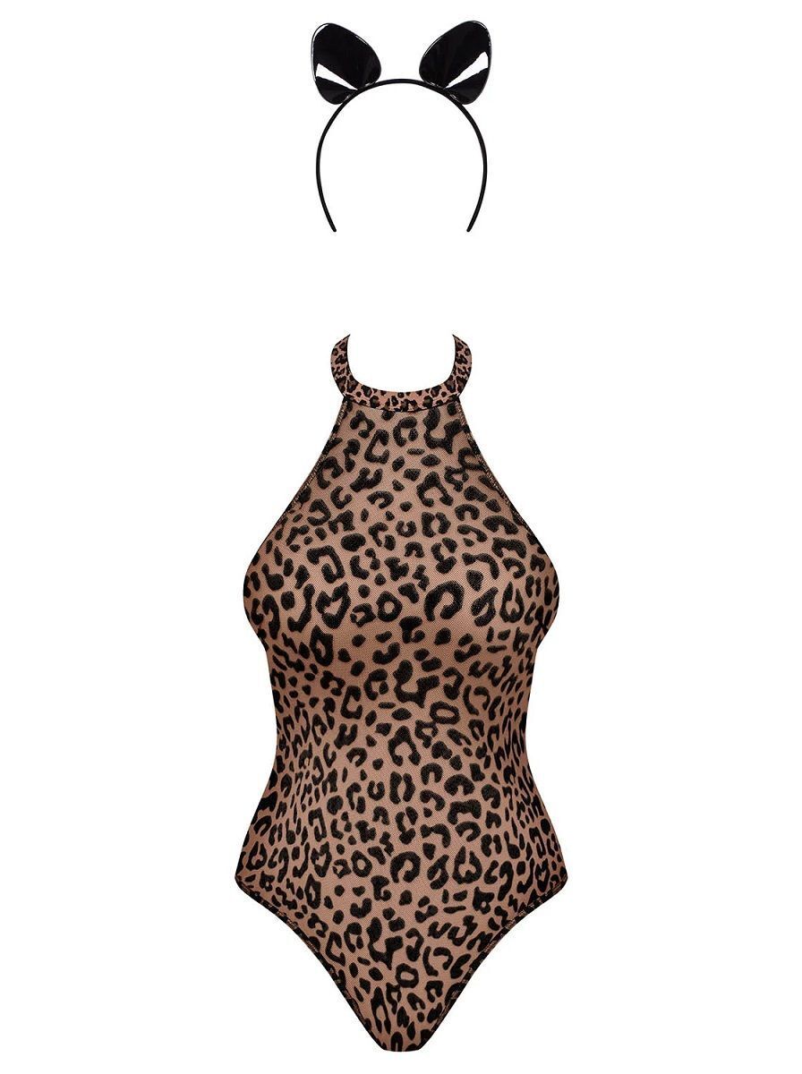 Игривый комплект дикой кошечки Leocatia состоит из боди с леопардовым принтом и ободка с ушками. Боди идеально облегает тело, спинка открытая, бретель фиксируется за шеей. В комплекте: боди, ободок.
