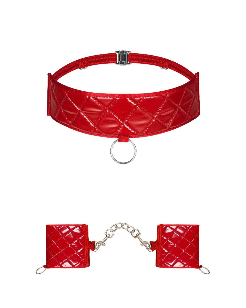 Комплект для ролевых игр Hunteria выполнен из экокожи с декоративной строчкой. Наручники соединены съемной цепочкой с карабинами. Чокер широкий, с тонкими резинками, сзади застежка. На чокере и наручниках есть кольца, при желании можно прицепить длинную цепь или поводок. В комплекте: наручники, чокер.