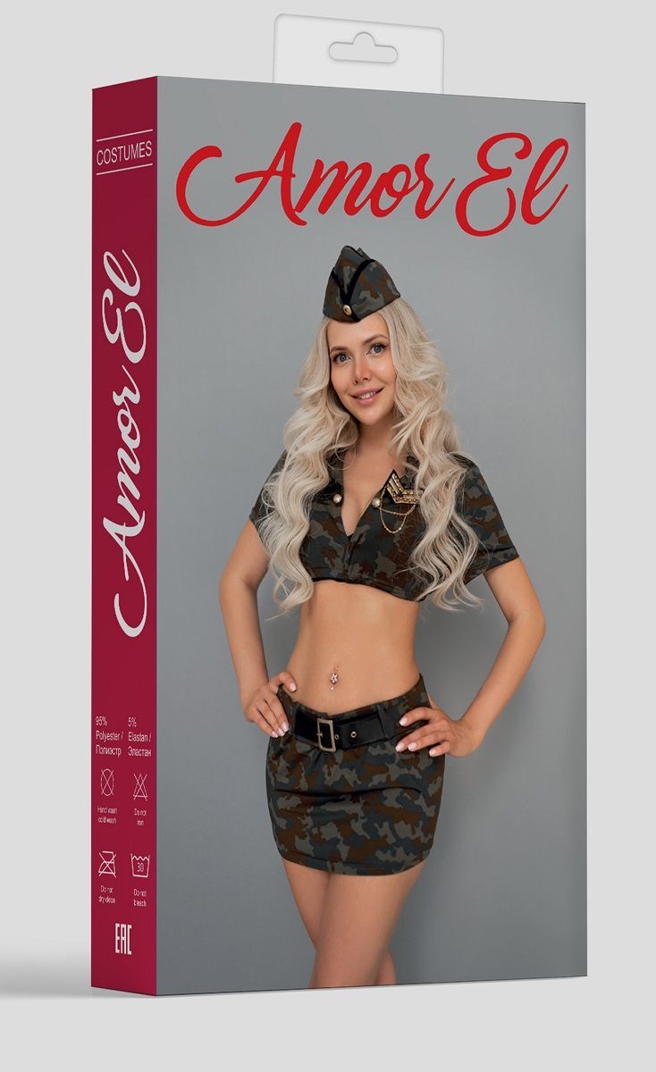 Игровой костюм военной. Топ с рукавчиками и коротенькая юбка дополнены фирменным головным убором. В комплекте: топ, юбка, головной убор.