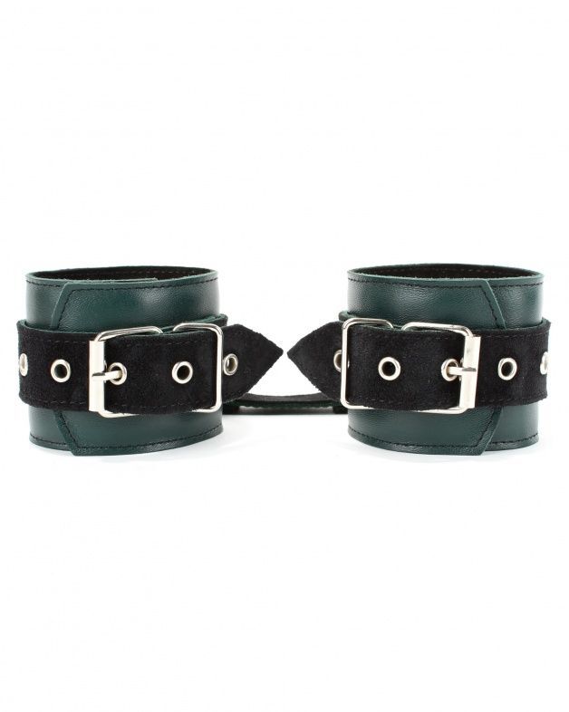 Наручники выполнены из натуральной кожи цвета бордо. Изделие декорировано ремнями из замши черного цвета. Обратная сторона изделия тоже выполнена из черной замши. По середине наручника расположено полукольцо из сварной фурнитуры. Наручники надежно фиксируются пряжками и ремнями, позволяющими выбрать нужный размер, подойдут на обхват руки от 16 до 25 см. Кожаное соединение на карабинах фиксирует наручники вместе. Стильные наручники отлично подходят для воплощения эротических БДСМ игр. Ширина - 6 см. Длина соединения - 18 см.
