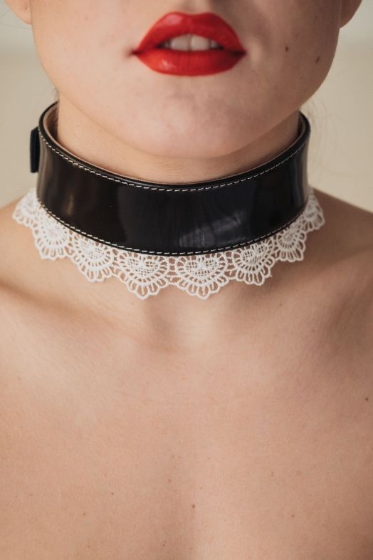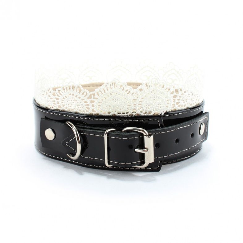 Ошейник выполнен из натуральной лакированной кожи черного цвета. Аксессуар декорирован белым кружевом. Ремень позволяет выбрать нужный размер, подойдет на обхват от 31 до 38 см. Металлическая пряжка надежно фиксирует. Подклад из нежной кожи обеспечивает комфорт. Нежный и страстный аксессуар станет отличным дополнение к Вашей БДСМ игре. Ширина кожаной части - 3,5 см.