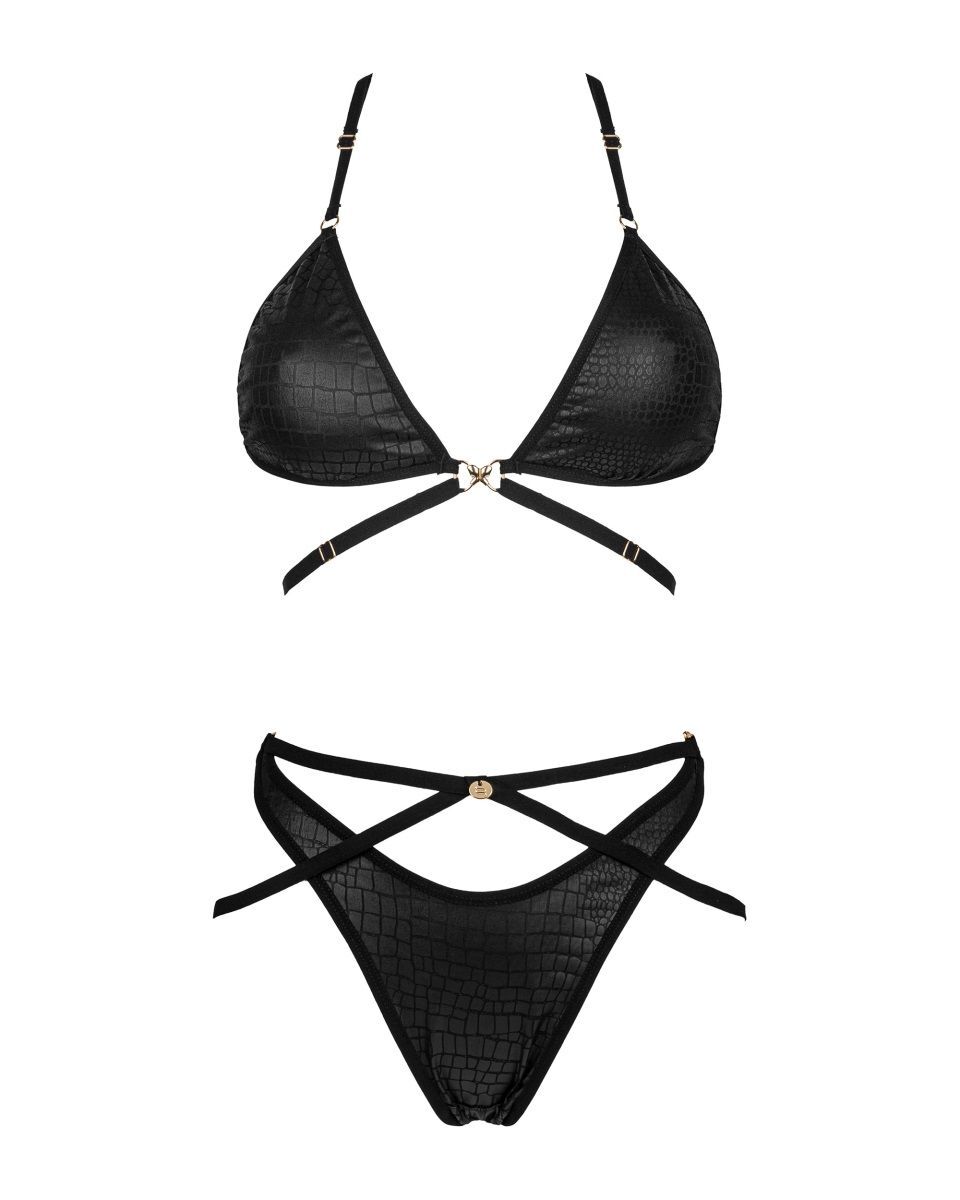 Невероятно сексуальный комплект белья из серии Cobra Nive сложного кроя из ткани с хищной фактурой. Мягкий бюстгальтер, бретельки регулируются по длине, между чашек застежка. Трусики-панти с тонкими союзками, с застежками по бокам, ластовица из 100% хлопка. В комплекте: бюстгальтер, трусики.