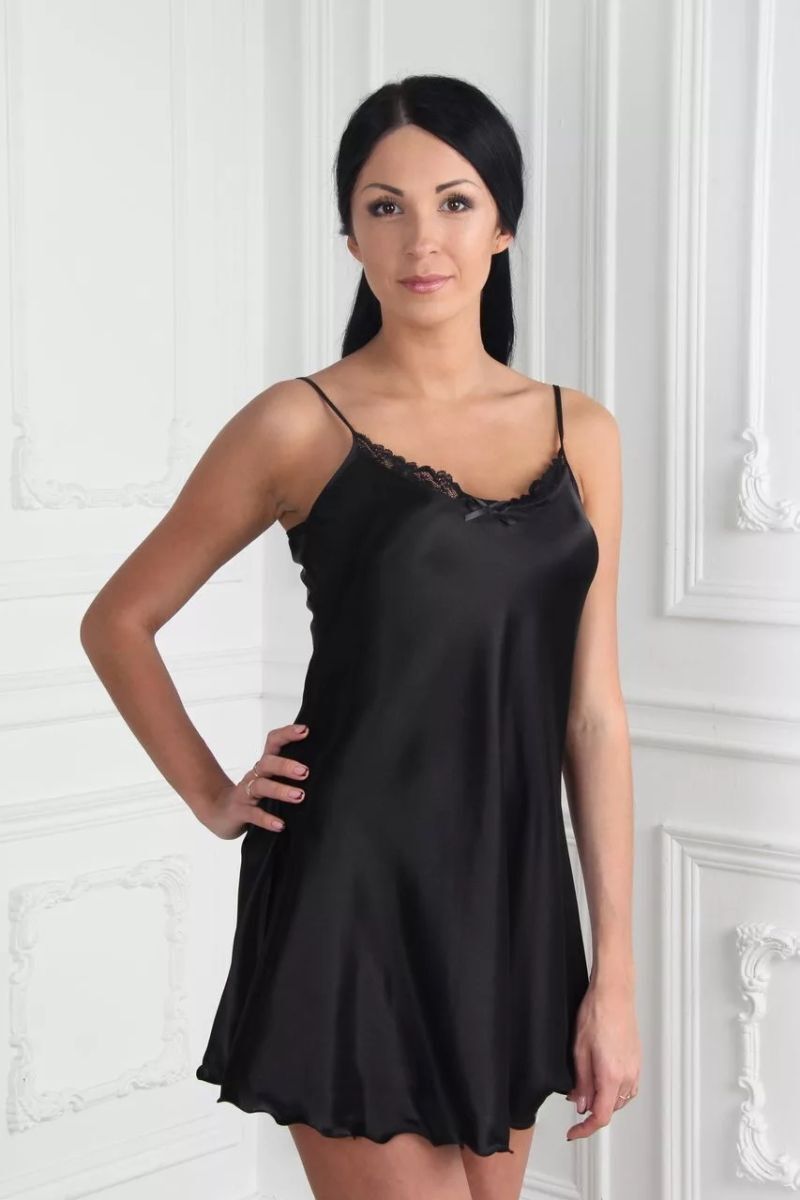 Короткая шелковистая сорочка на тонких регулируемых бретелях, выполнена из искусственного шелка, декорирована тонким ажурным кружевом в тон.