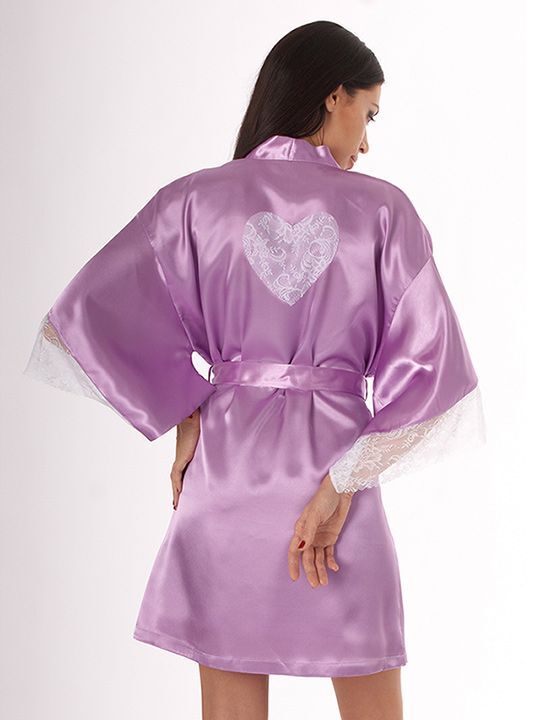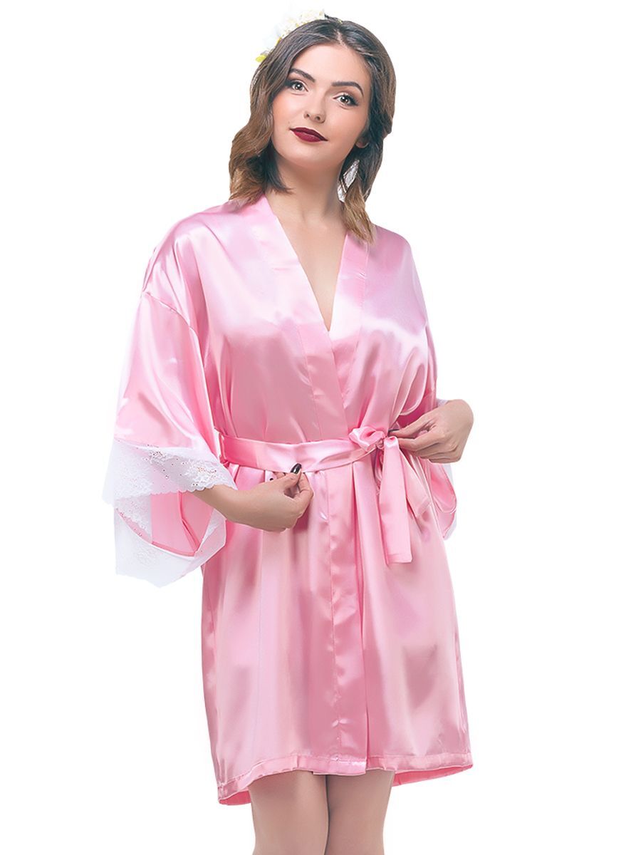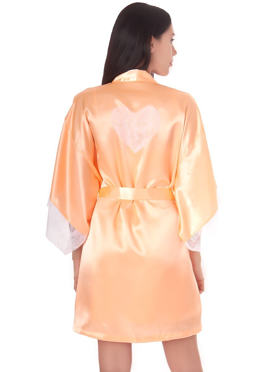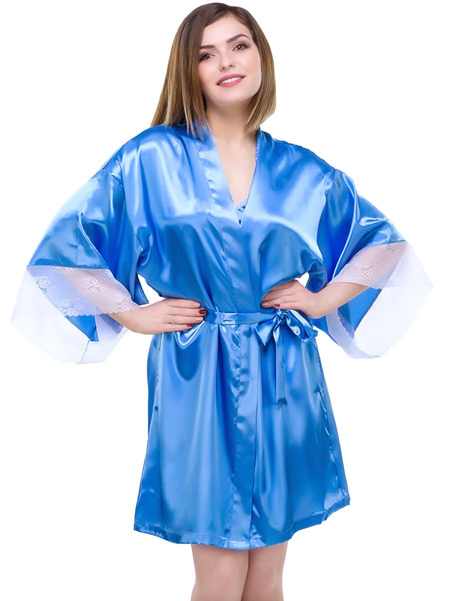 Короткий кокетливый халатик покроя кимоно из однотонного искусственного шелка, с запахом под пояс. Рукава широкие, длиной три четверти, с удлинённой проймой, по низу отделаны изысканным ажурным кружевом с фестонами. На спинке выполнена декоративная вставка в форме сердечка из ажурного кружева. Соответствие размеров: L - 50-52, F - 42-48.