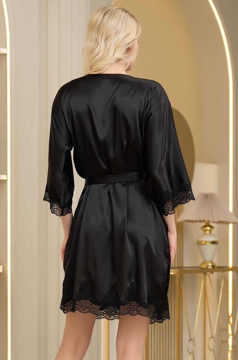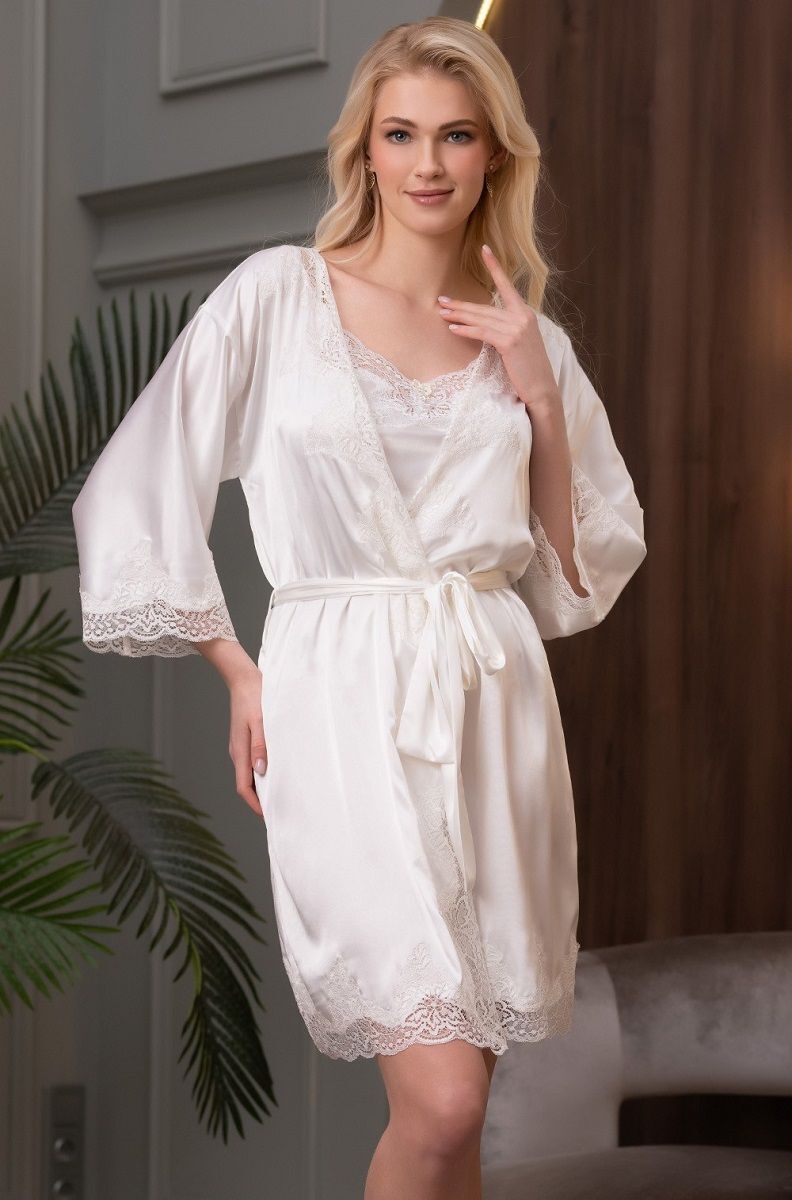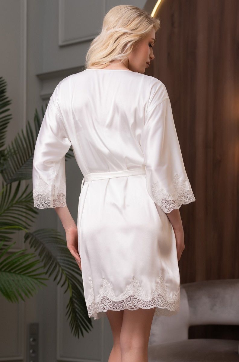Короткий халат выполнен из смесового шелкового полотна. Борт, низ халата и рукавов декорированы тонким кружевом, вырезанная по форме кружева кромка ткани придает удивительную воздушность модели. Дизайн коллекции - студия Angelo Bellini (Milano).