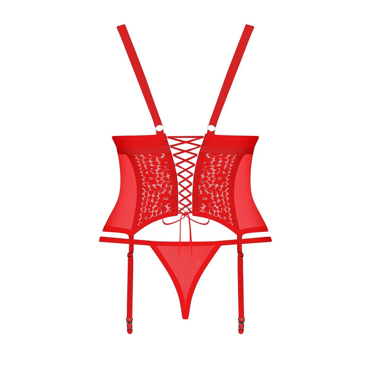 Корсет Blossmina из эластичной ткани с кружевными вставками усилен продольными косточками, лиф мягкий, выполнен в стиле тирольского платья, снабжён маленькой декоративной шнуровкой, на спине корректирующая размер шнуровка, бретели регулируются по длине, пажи для чулок регулируются по длине. Корсет комплектуется стрингами. В комплекте: корсаж, трусики-стринги.