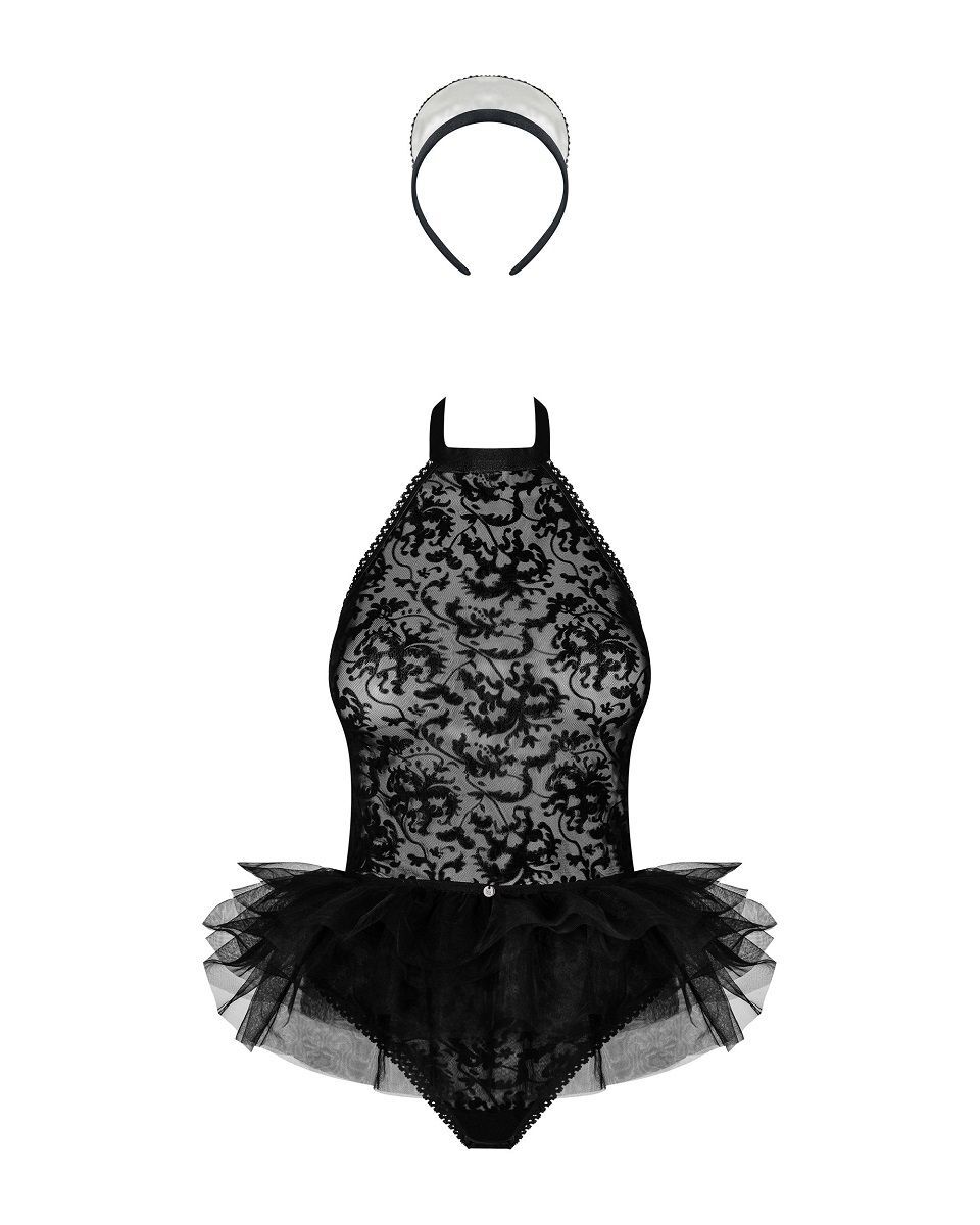 Костюм горничной для ролевых игр Frilles из трех предметов. Боди из полупрозрачного материала с цветочным рисунком, с застежкой на шее сзади и снизу. Короткая пышная юбочка из многослойного тюля с атласными завязками и ободок на голову. В комплекте: боди, юбка, ободок.