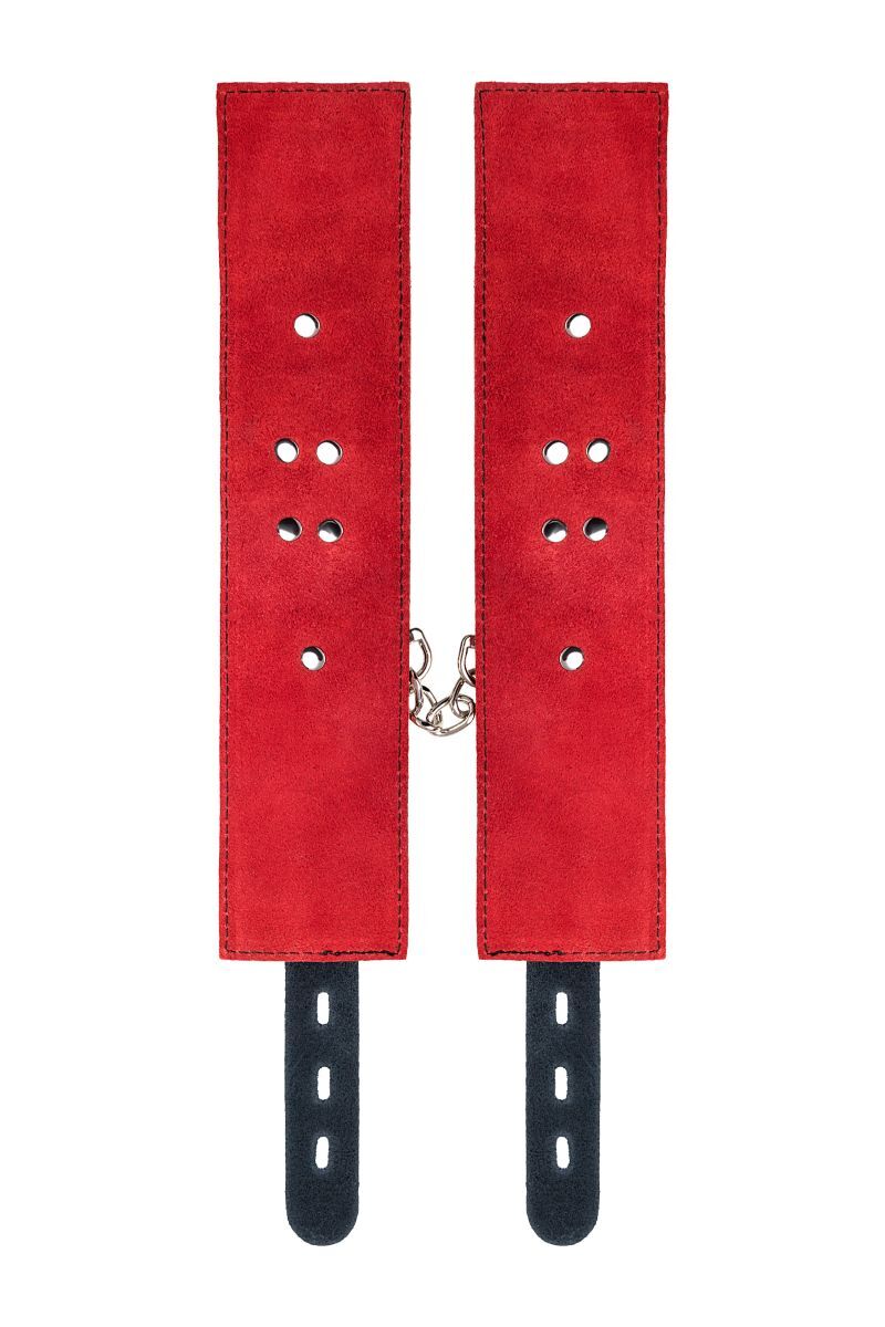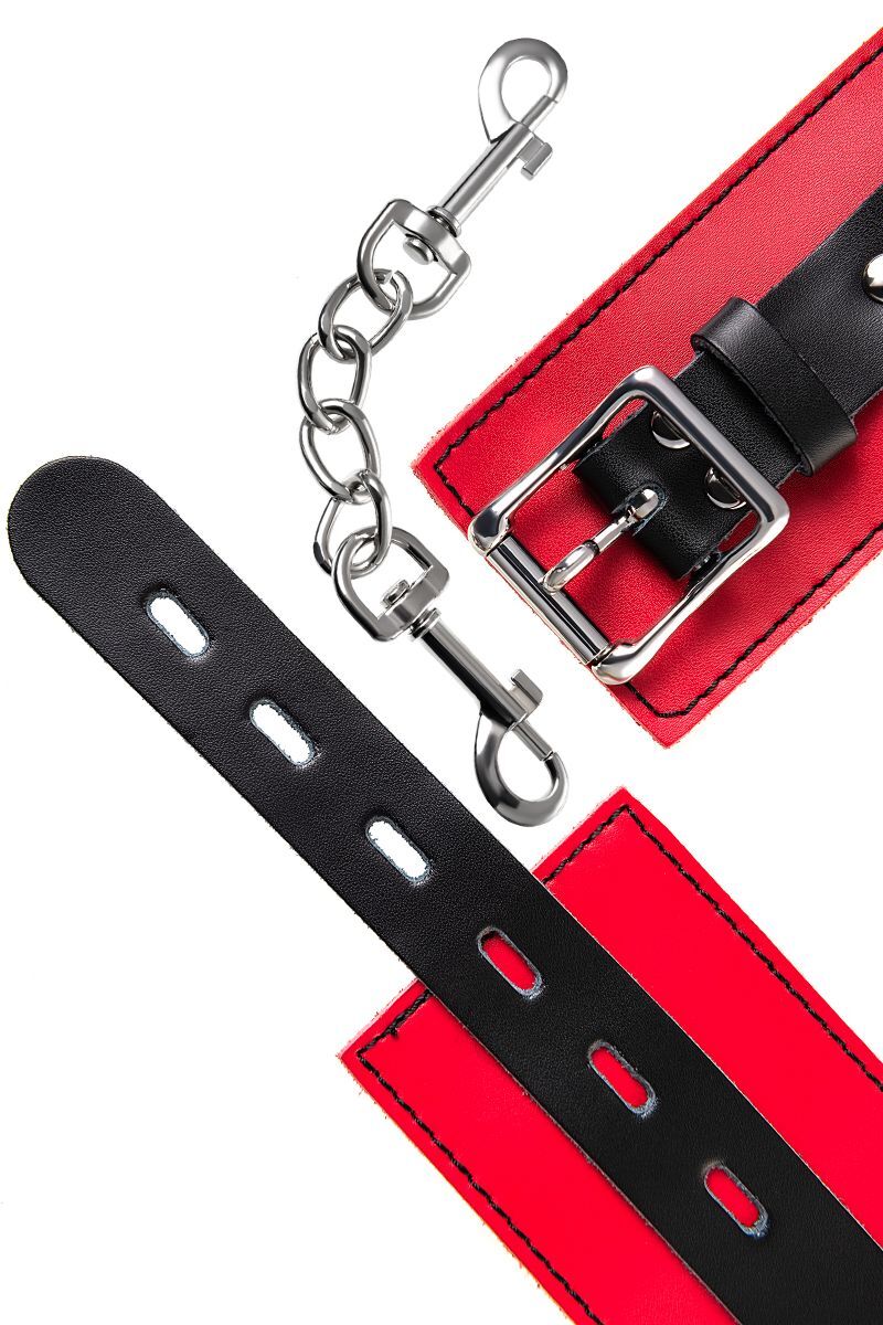 Оковы на ноги - волнующий воображение аксессуар, ведь это способ зафиксировать ноги партнера и получить полный доступ к его телу. Оковы из мягкой натуральной кожи сочетают в себе элементы, возбуждающие страсть и фантазию: красный и черный цвета и отделка металлическими элементами. В них будет комфортно подчиняться и ощущать ограничение свободы действий. Не натирают и имеют надежную степень фиксации. Размер легко регулируется металлической пряжкой. С помощью металлической цепочки и карабинов можно фиксировать ноги вместе, либо дополнить игру цепочкой и сковать ноги в широко разведенном положении. Длина манжет - 28 см., ширина - 6 см. Длина сцепки - 15,5 см.