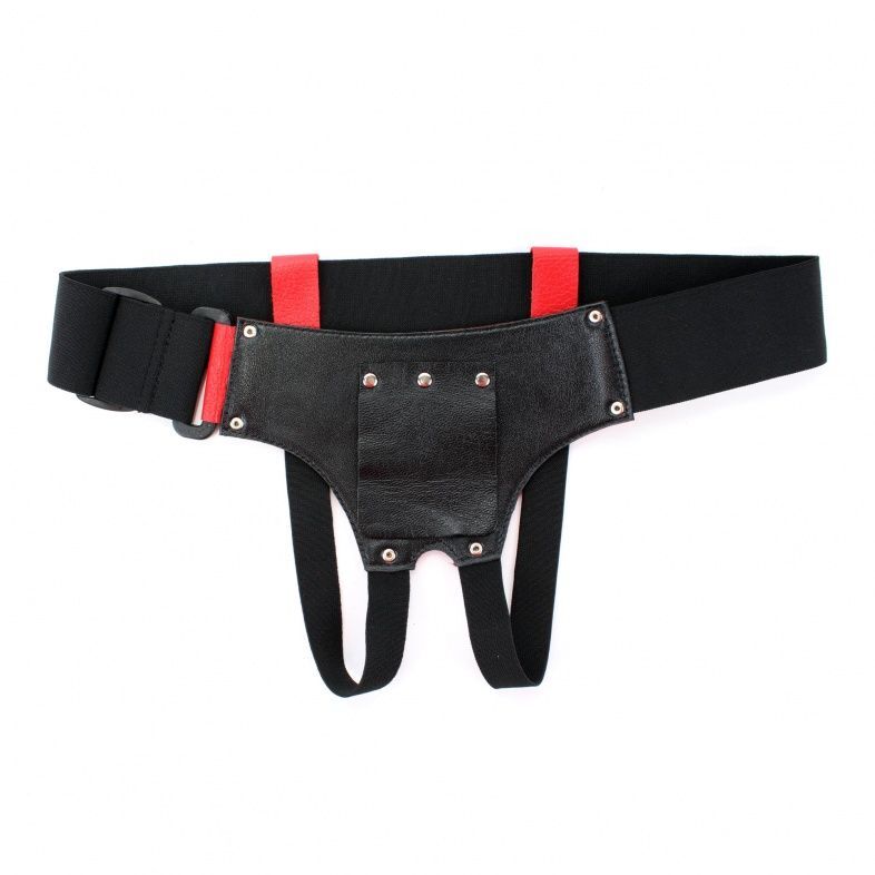 Трусики выполнены из натуральной кожи красного цвета с элементами из черных эластичных резинок, надежно фиксирующих изделие на теле. Спереди крепится штырек харнесс для насадок (входит в комплект). Трусики-джоки обеспечивают доступ к интимным зонам. Размер удобно регулируется, подойдет на 42-46. Максимально комфортный аксессуар разнообразит любую БДСМ игру. Ширина резинки на поясе - 5 см.