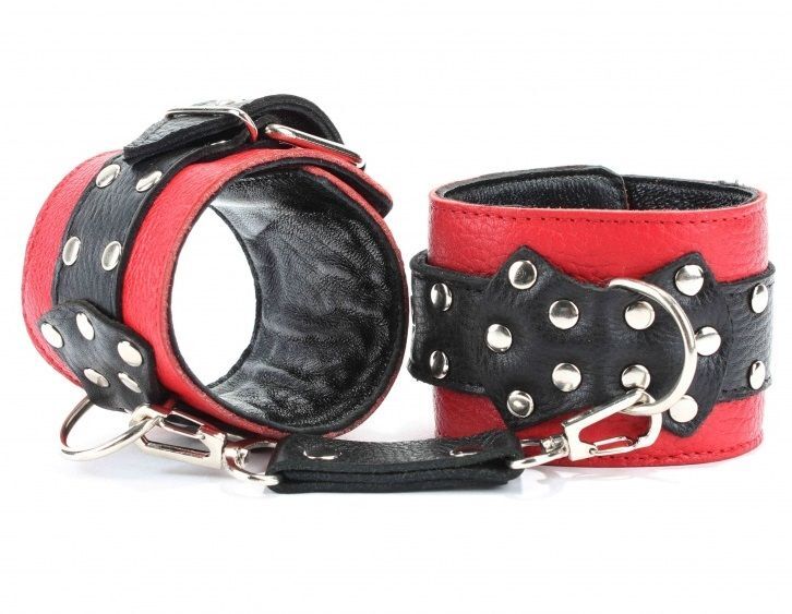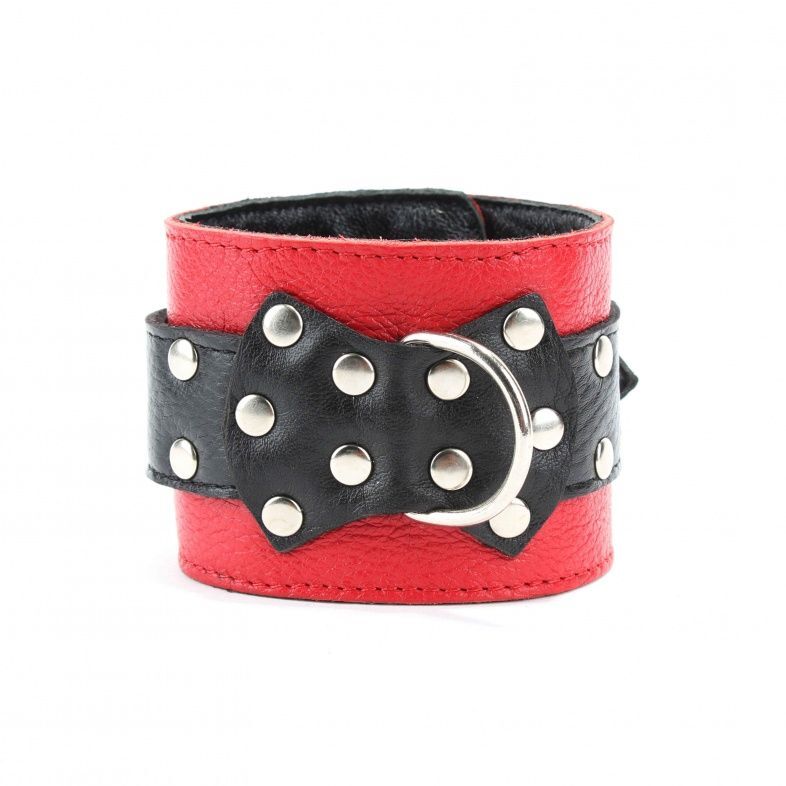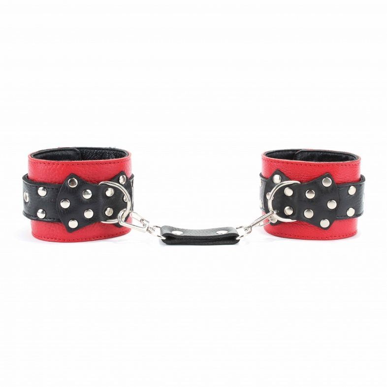 Оковы выполнены из красной натуральной кожи, с ремнями из черной кожи. Аксессуар украшен заклепками и бантом с металлическим полукольцом. Оковы надежно фиксируются пряжками и ремнями, позволяющими выбрать нужный размер, подойдут на обхват от 18 до 27 см. Нежный подклад из перчаточной кожи обеспечивает комфорт, кожаное соединение на карабинах фиксирует оковы вместе. Аксессуар позволяет в полной мере насладиться сексом в стиле БДСМ. Ширина - 6 см. Длина соединения - 14 см.