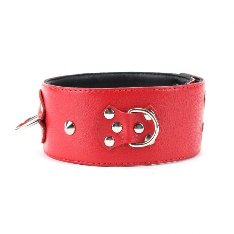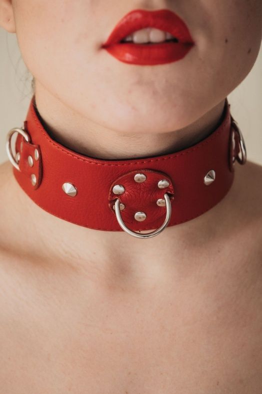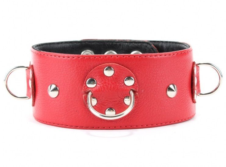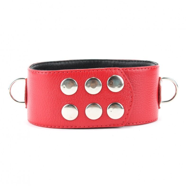 Ошейник выполнен из натуральной кожи красного цвета, декорирован заклепками. На изделии находятся три сварных полукольца. Аксессуар декорирован металлическими заклепками. Ошейник фиксируется металлическими кнопками, позволяющими подобрать нужный размер, подойдет на обхват от 32 до 37 см.Стильный аксессуар поможет воплотить эротические фантазии в реальность. Ширина ошейника - 5 см.