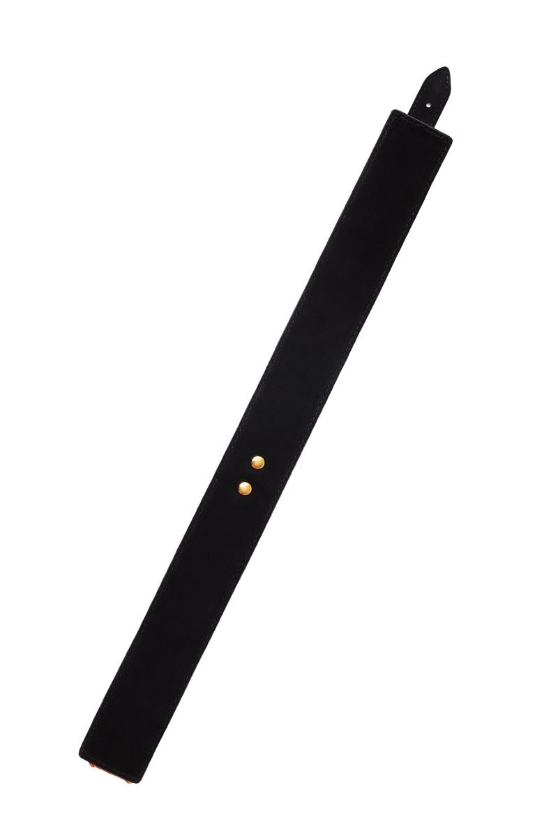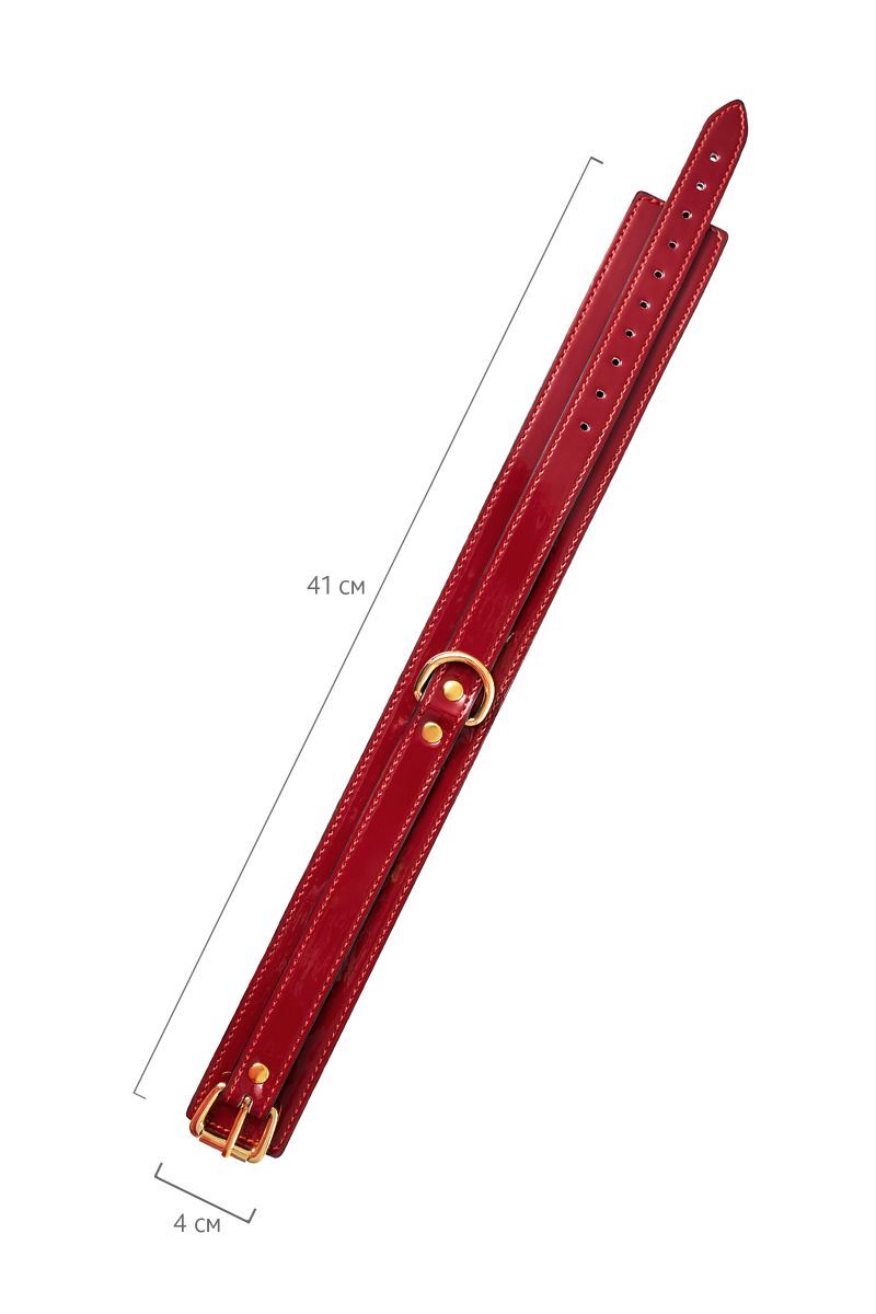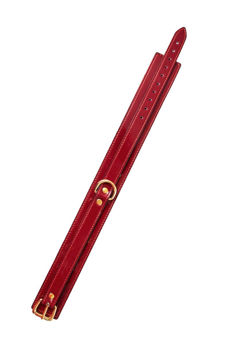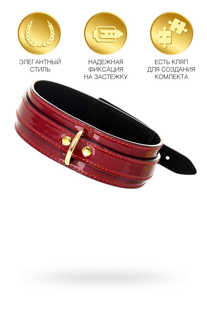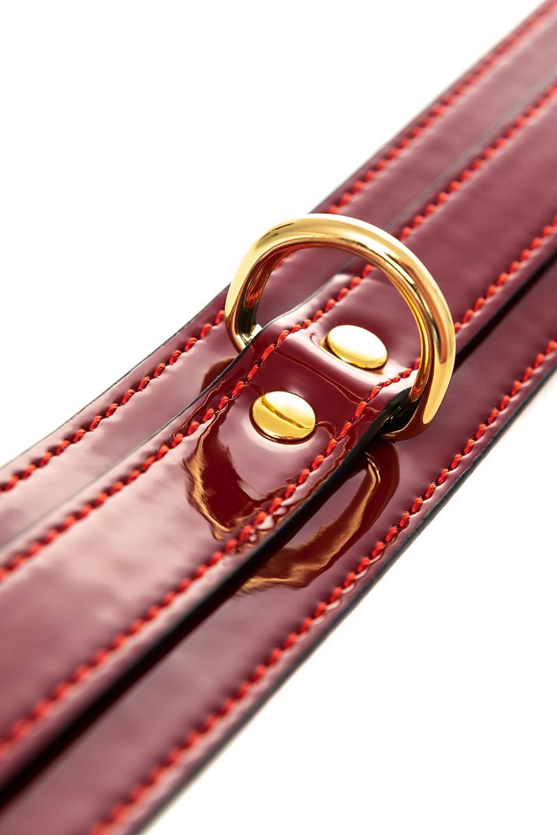 Ошейник из лакированного материала благородного винного цвета с металлической отделкой золотого цвета. Он демонстрирует утонченный вкус обладателя, одновременно являясь достаточно строгим атрибутом БДСМ-тематики. Он достаточно жестко обхватывает шею, зато в нем вы всегда будете слушаться своего Господина без возможности опустить голову. Кольцо на ошейнике позволяет дополнить игру поводком или другими необходимыми аксессуарами. Размер регулируется металлической пряжкой. Ширина - 4 см.