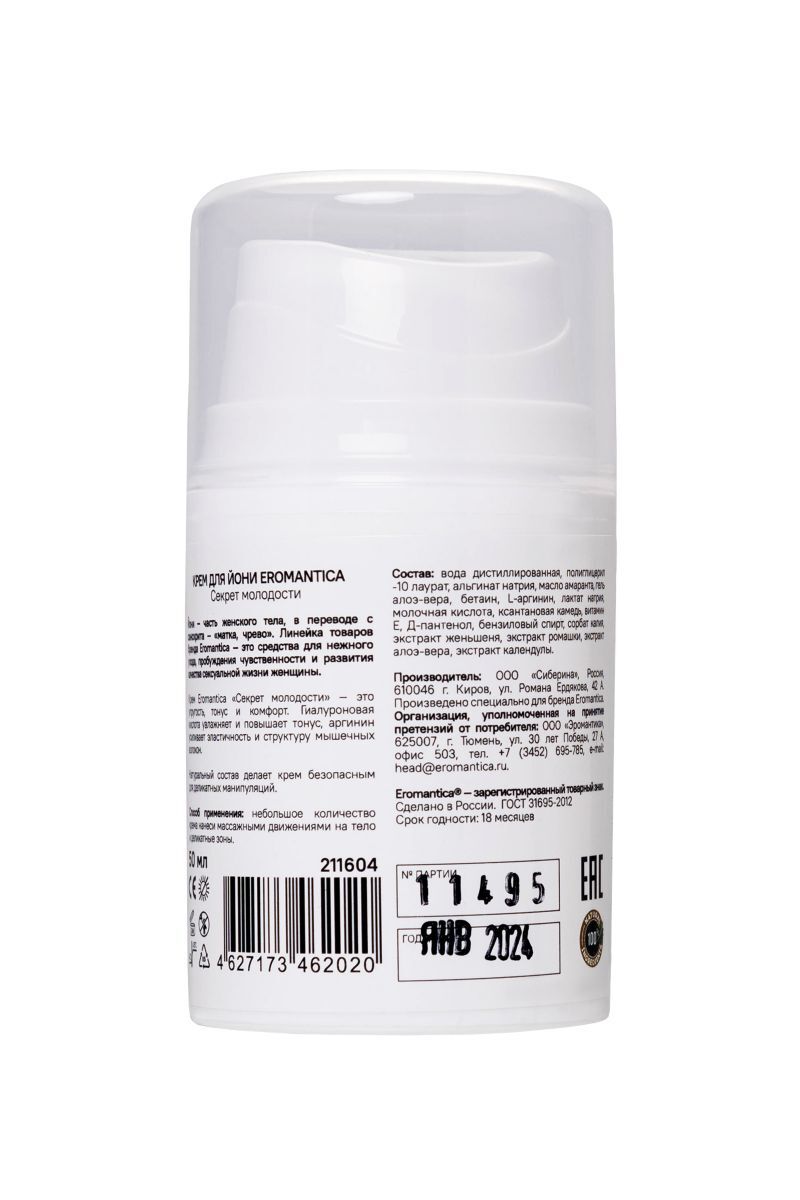 Серия натуральных интимных кремов для женского здоровья построит главные отношения в твоей жизни на любви и уважении к себе. Искусство ухода за йони от Eromantica повысит чувствительность, разбудит сексуальность и вернёт к истокам наслаждения! Крем «Секрет молодости» обогащён L-аргинином, который увеличивает синтез коллагена естественным для организма путём, восстанавливает эластичность тканей, борется с признаками их преждевременного старения и является мощным оружием против бактериальных и вирусных инфекций в интимной зоне. Масло амаранта, экстракт женьшеня и гель алое-вера в составе крема обладают высокими увлажняющими свойствами, оказывают регенерирующее и ранозаживляющее действие и в буквальном смысле слова дают «второе дыхание» чувствительной к возрастным изменениям коже. Использование крема при занятиях упражнениями Кегеля укрепит мышцы тазового дна, насытит ткани кислородом и улучшит структуру мышечных волокон. Здоровая сексуальность женщины напрямую связана с уровнем счастья и удовлетворённости жизнью, а кремы для ухода за йони от Eromantica питают и укрепляют эту связь!
