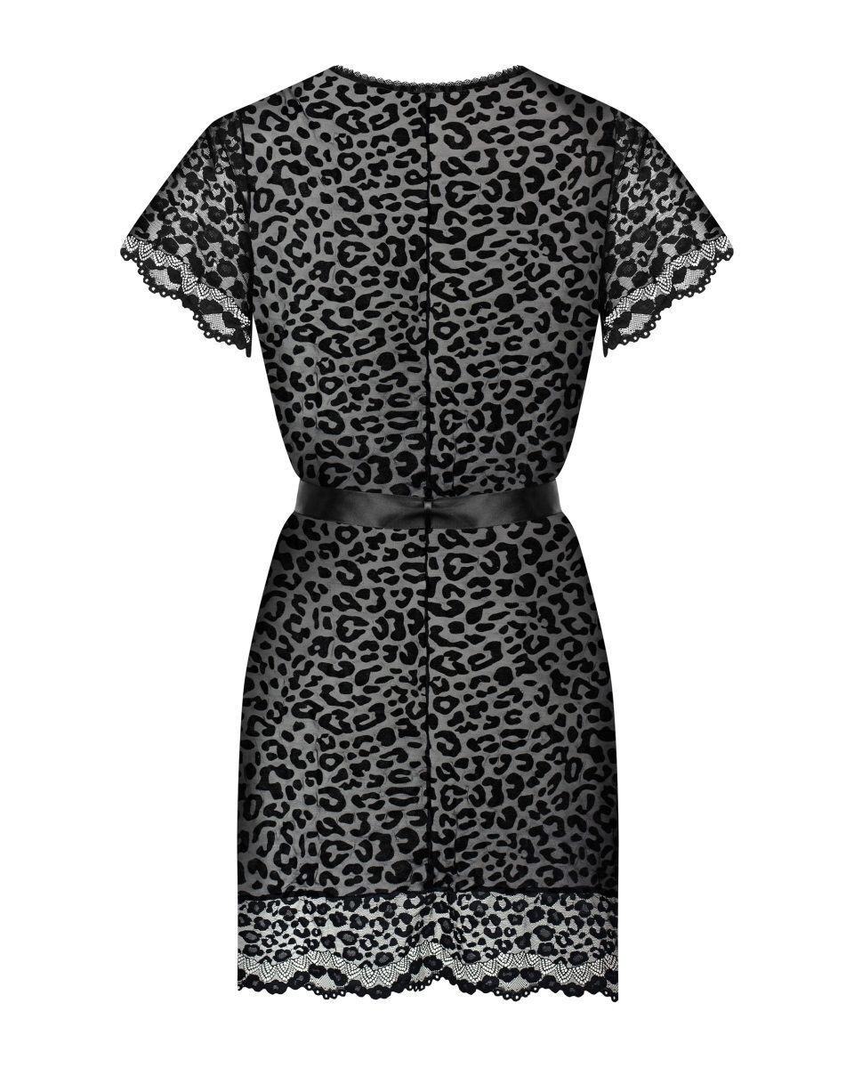Очаровательный пеньюар из коллекции Giully с короткими рукавчиками из полупрозрачной вуали с хищным принтом флоком. Глубокий вырез на груди декорирован изящным кружевом, на талии пояс из атласной ленты.