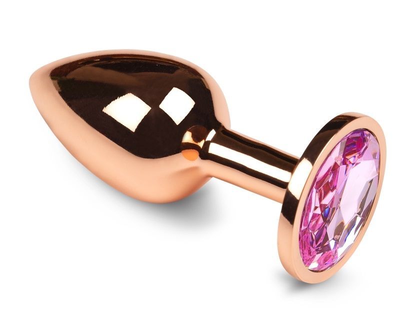Маленькая золотистая анальная пробка с розовым кристаллом - 6 см.