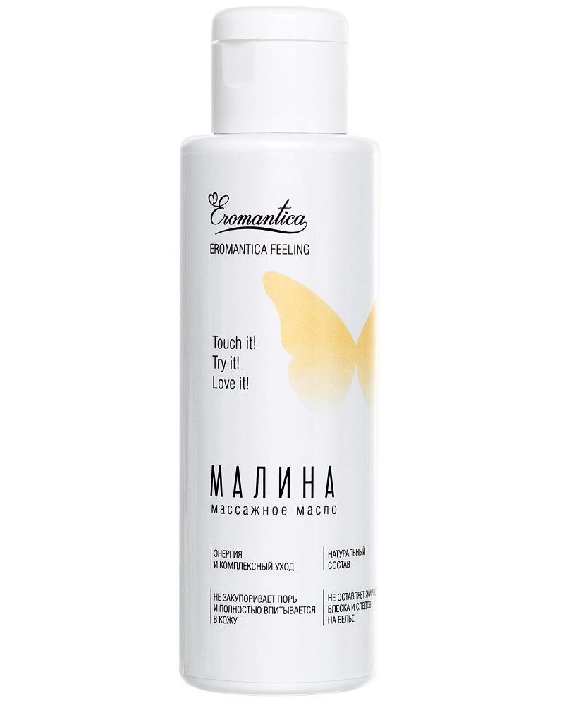 Коллекция натуральных массажных масел Eromantica — это возможность рассказать Ему о своих чувствах. Массажное масло Eromantica «Малина» с тонким ягодным ароматом помогает разбудить чувства и создает атмосферу беззаботности и романтики. Его легкая текстура придает каждому движению рук возбуждающее шелковистое скольжение и сохраняет его на протяжении всего сеанса массажа. Микс натуральных масел оливы, миндаля и семян льна интенсивно насыщает кожу жирными кислотами, витаминами и микроэлементами, делая ее бархатистой и восприимчивой к прикосновениям. Встряхни и используй для: - Эротического массажа: согрей масло в ладонях и распредели его по телу партнера плавными массажными движениями. Особое внимание уделяй эрогенным зонам. - Тонизирующего массажа: нанеси масло на нужный участок тела и разогрей кожу интенсивными движениями. Затем проработай мышцы, сжимая их пальцами рук. - Ухода за телом: нанеси сразу после душа на влажную кожу и равномерно распредели по телу. Храни при комнатной температуре. Избегай попадания прямых солнечных лучей. Встряхивай перед каждым применением.