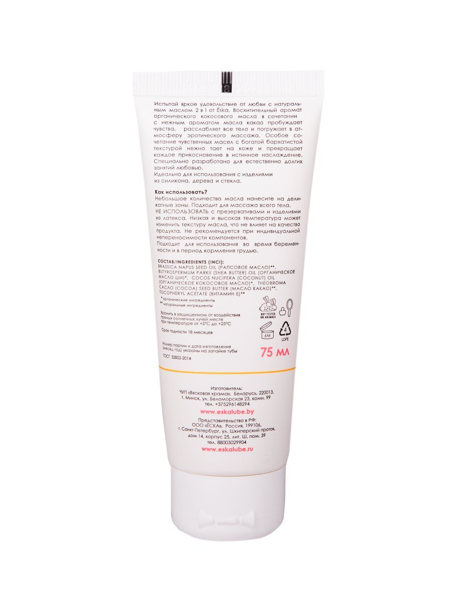 Испытай яркое удовольствие от любви с натуральным маслом 2 в 1 от Ёska. Восхитительный аромат органического кокосового масла в сочетании с нежным ароматом масла какао пробуждает чувства, расслабляет все тело и погружает в атмосферу эротического массажа. Особое сочетание чувственных масел с богатой бархатистой текстурой нежно тает на коже и превращает каждое прикосновение в истинное наслаждение. Специально разработано для естественно долгих занятий любовью. Идеально для использования с изделиями из силикона, дерева и стекла. 100% натуральных ингредиентов 2 в 1: лубрикант и массажное масло Натуральная альтернатива силикону Максимально длительное естественное скольжение Только растительные ингредиенты Без силиконов, отдушек, консервантов, глицерина, минерального масла Подходит для анального, вагинального и орального секса Безопасен для использования во время беременности и в период кормления грудью Крем-масло интенсивно питает и смягчает кожу, делает её нежной и бархатистой Восхитительный аромат какао и кокосового масла пробуждает желание, делая каждое прикосновение особенным Подходит для использования в воде Совместимо с изделиями из силикона, дерева и стекла 100% съедобное Истинное наслаждение от чувственной любви Улучшает интимную жизнь естественным способом