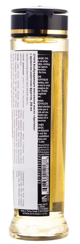 Массажное масло с ароматом азиатских фруктов Irresistible Asian Fusion. 100% натуральные масла холодного отжима, с витамином Е (антиоксидант), без жирных остатков, не забивает поры, нет минерального или животного масла. Мягкость и шелковистость этого масла с приятным скользящим эффектом на коже вызывает ощущение полного восторга. Сексуальное желание нарастает и вы готовы к любви. Получите взаимное удовольствие от чувственного эротического массажа с использованием нашей эксклюзивной смеси масел холодного отжима, тщательно отобранных за свои стимулирующие и придающие энергию свойства. Масло легко скользит по коже, не оставляя жирных ощущений, в то время как различные экзотические ароматы поднимут ваши чувства до вершин возбуждения. Идеально подходит для того, чтобы насладиться расслабляющим массажем или сделать его, совместив с обволакивающими обольстительными ласками. Это на 100 % натуральное масло с упоительным ароматом, легко скользит по коже, не оставляя жирной пленки. Запах массажному маслу придают эфирные масла и отдушки, что в отличие от большей части другой продукции SHUNGA, ароматизированной вкусовыми добавками, делает его несъедобным.