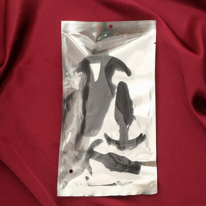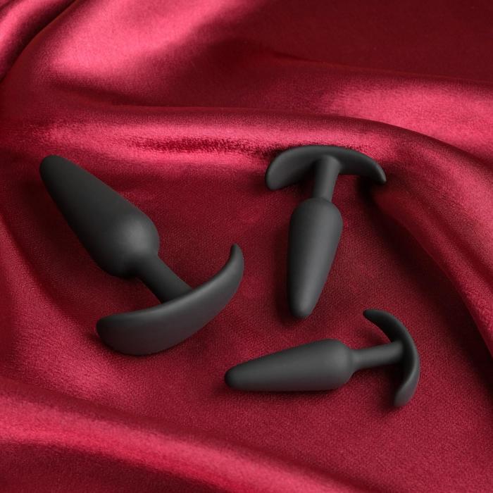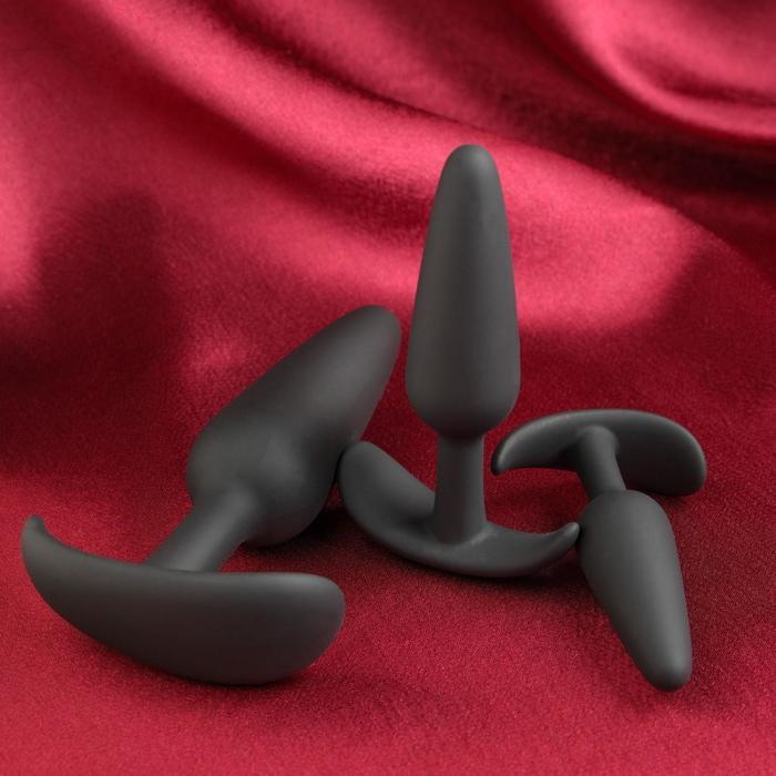Набор из 3 черных анальных пробок. Имеют одинаковую форму, но разные размеры. Дугообразное ограничительное основание не позволит протолкнуть игрушку на опасную глубину. Рабочая длина большой пробки - 8,5 см., диаметр - 3,1 см. Рабочая длина средней пробки - 6,5 см., диаметр - 2,4 см. Рабочая длина средней пробки - 6 см., диаметр - 1,9 см.