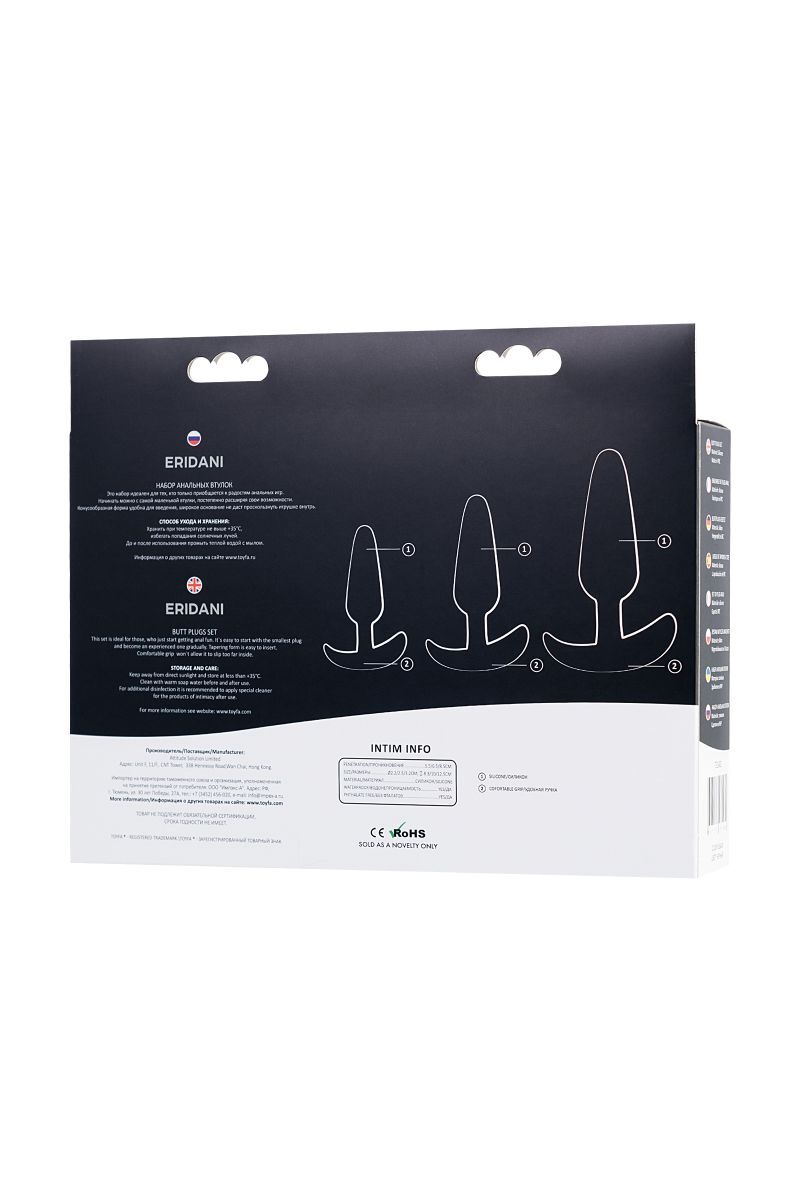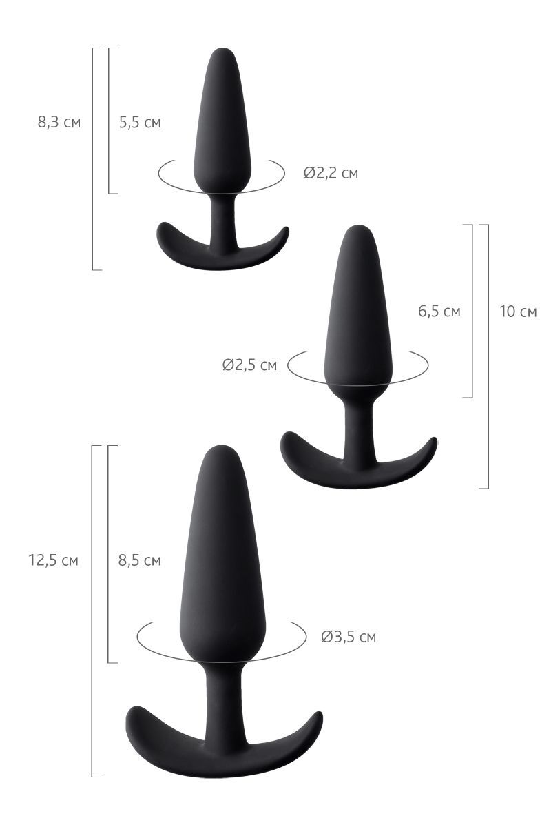 Это набор идеален для тех, кто только приобщается к радостям анальных игр. Начинать можно с самой маленькой втулки, постепенно расширяя свои возможности. Конусообразная форма удобна для введения, широкое основание не даст проскользнуть игрушке внутрь. Длина большой втулки – 12,5 см., рабочая длина - 8,5 см., диаметр - 3,2 см. Длина средней втулки - 10 см., рабочая длина - 6,5 см., диаметр - 2,5 см. Длина малой втулки - 8,3 см., рабочая длина - 5,5 см., диаметр - 2,2 см.