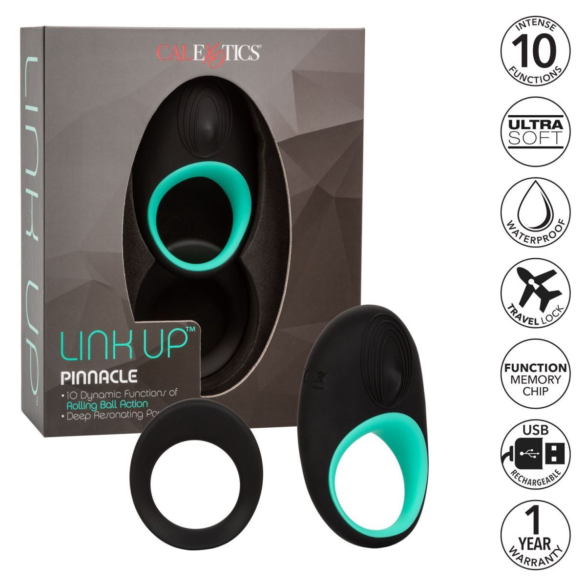 Набор эрекционных колец Link Up Pinnacle – двойное стимулирующее кольцо доставляет интенсивное удовольствие с 10 мощными функциями вибрации и движением мини язычка на стимуляторе, дополнительным поддерживающим кольцом Ultra-Soft и дразнящей ребристой текстурой. Оно изготовлено из гладкого, шелковистого на ощупь, безопасного для здоровья медицинского силикона. Кольцо препятствует оттоку крови для поддержания эрекции и замедляя процесс эякуляции. Оно имеет уникальную ребристую форму обеспечивающую дополнительную стимуляцию клитора или яичек во время полового акта. Бархатистая поверхность обеспечит максимально нежные тактильные ощущения. Управление осуществляется с помощью всего одной кнопки в головке. Для переключения скорости достаточно всего одного нажатия. Кольцо заряжается через специальный аккумуляторный USB-кабель и может быть подключено практически в любом месте. Просто подсоедините идущий в комплекте шнур к изделию и совместимому порту компьютера или USB-адаптера (приобретается отдельно). Полная зарядка занимает 2,5 часа, ее достаточно для беспрерывной работы до 1,5 часа высокоинтенсивной вибрации. Длина виброкольца - 9 см., диаметр - 3,75 см. Диаметр эрекционного кольца - 3,75 см.
