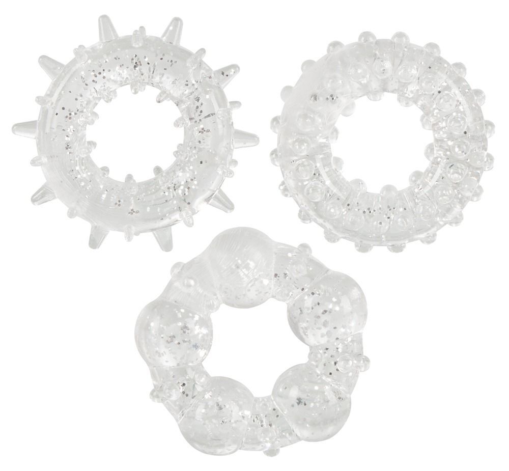 Набор силиконовых эрекционных колец из трех штук на мужской половой ораган. Материал - переливающийся, блестящий, очень эластичный.