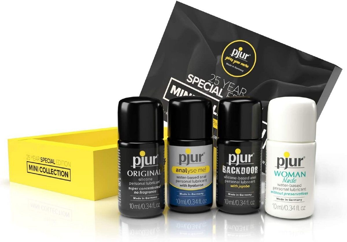 Когда дело заходит о качестве продукции Pjur, специалисты компании не идут на компромиссы. Высокотехнологичный процесс производства, тщательный отбор ингредиентов и непрестанные проверки (дерматологические и цитотоксические тесты, испытания с презервативами и пр.) гарантируют высокое качество каждого из выпускаемых продуктов. Эксклюзивный набор самых популярных лубрикантов компании выпущенный в честь ее 25-летия. Включает в себя - подарочную упаковку, два лубриканта на силиконовой основе, два лубриканта на водной основе: pjur Original (10 мл), pjur MED Repair Glide (10 мл), pjur Back Door Relaxing Anal Glide (10 мл), pjur Woman Nude (10 мл).