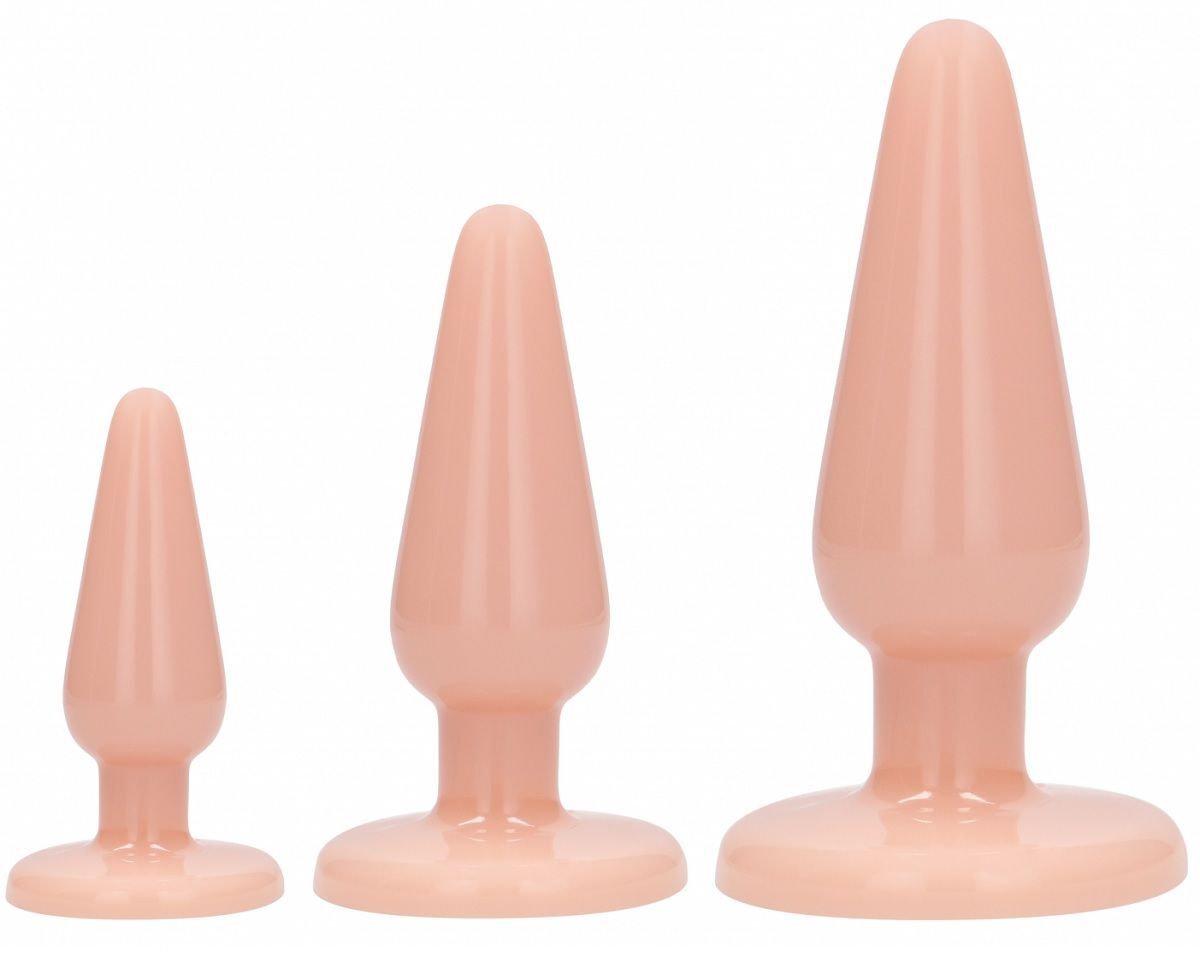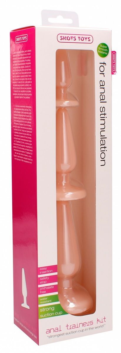 Anal Trainers Kit - набор из трех классических анальных пробок разного размера. Округлый кончик и конусообразная форма способствуют более комфортному проникновению и стимуляции. Широкое основание уберегает пробку от проваливания внутрь прямой кишки. А с помощью ультрасильной присоски у основания игрушка может быть закреплена на горизонтальной или вертикальной поверхности. Пробки изготовлены из мягкой резины, не содержащей фталатов. Гигиеничный материал, не обладает запахом и абсолютно безопасен для здоровья. Длина большой пробки - 11,5 см., диаметр - 4,2 см. Длина средней пробки – 9 см., диаметр – 3,3 см. Длина малой пробки – 6,5 см., диаметр - 2,5 см.