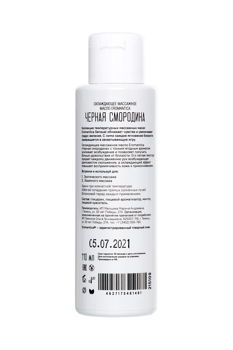 Коллекция температурных массажных масел Eromantica Sensual обнажает чувства и увеличивает градус желания. С ними каждое мгновение близости превращается в захватывающую игру. Охлаждающее массажное масло Eromantica «Черная смородина» с тонким ягодным ароматом усиливает возбуждение и позволяет получить больше удовольствия от близости. Его легкая текстура придает каждому движению рук возбуждающее шелковистое скольжение, а охлаждающий эффект повышает восприимчивость кожи к прикосновениям. Сладкий вкус без горького послевкусия делает оральные ласки еще приятней и побуждает к исследованию тела партнера. Встряхни и используй для: - Эротического массажа: нанеси на чувствительные участки тела или отдельные эрогенные точки. Подуй на них, чтобы партнер ощутил возбуждающий холодок. - Взаимного массажа: нанесите масло на эрогенные зоны, заводите друг друга охлаждающим дыханием или взаимными поцелуями. - Оральных техник: нанеси небольшое количество масла, чередуй мануальные и оральные ласки. Храни при комнатной температуре. Избегай попадания прямых солнечных лучей. Встряхивай перед каждым применением.