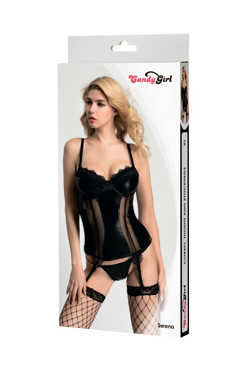 Корсаж с плотными чашками Candy Girl Serena визуально увеличит объем груди и добавит стройности силуэту благодаря продольным косточкам и регулируемым пажам. Сочетание эластичной сетки, ткани wetlook и кружева порадует любительниц интересных фактур. Регулируемые съемные бретели и многорядная застежка на спине обеспечат идеальную посадку. Стринги и чулки из крупной сетки с уплотненными мысками идеально дополнят образ. В комплекте: корсаж, трусики-стринги, чулки.