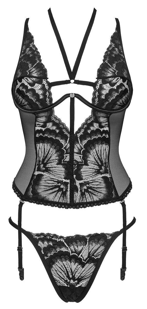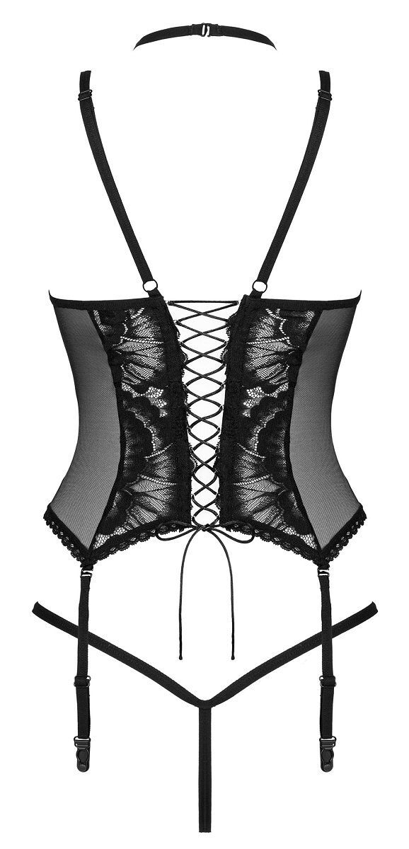 Женский эластичный корсаж из серии Alessya выполнен из прозрачной вуали и кружева с цветочным узором. Лиф на косточках, в зоне декольте тонкие бретели, вертикальные косточки спереди гарантируют идеальную посадку. Бретельки регулируются по длине, на спине корректирующая размер шнуровка, к подолу крепятся съемные пажи для чулок. В комплекте: корсаж, трусики-стринги.