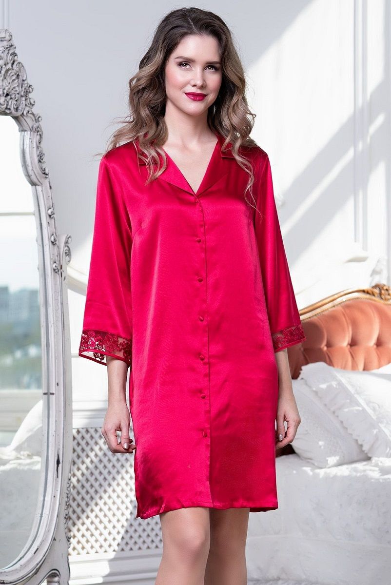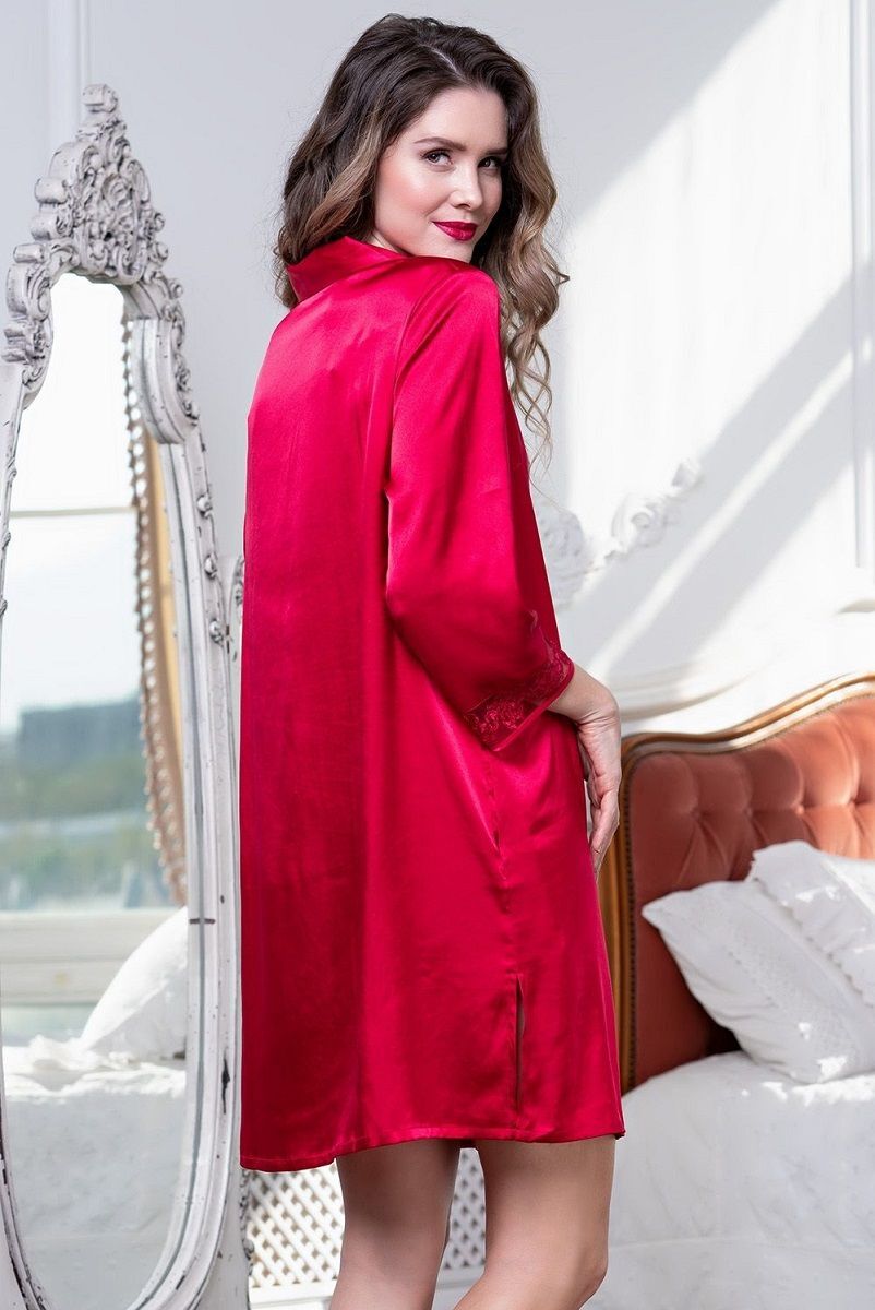 Короткий халат на пуговицах с рукавом 3/4, выполнен из однотонного искусственного шелка. Низ рукавов украшен ажурной вышивкой на сетке. В боковых швах расположены карманы. Линию талии можно подчеркнуть за счет пояса, который идет в комплекте.