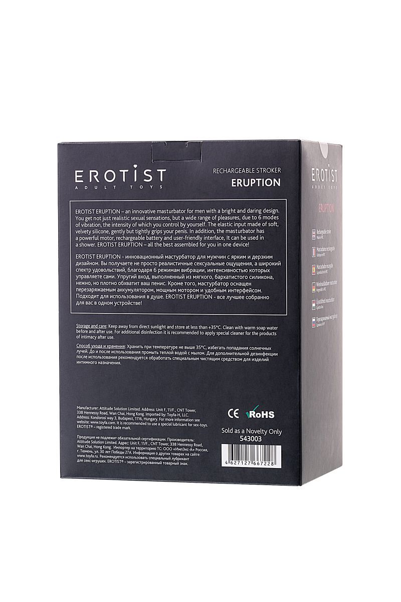 Erotist Eruption - инновационный мастурбатор для мужчин с ярким и дерзким дизайном. Отличительная особенность устройства – внутренняя поверхность не копирует женское влагалище, однако превосходит его по своим характеристикам. Вы получаете не просто реалистичные сексуальные ощущения, а широкий спектр удовольствий, благодаря 6 режимам вибрации, интенсивностью которых управляете сами. Упругий вход, выполненный из мягкого, бархатистого силикона, нежно, но плотно обхватит головку пениса. Кроме того, мастурбатор оснащен перезаряжаемым аккумулятором, мощным мотором и удобным интерфейсом. Подходит для использования в душе. Erotist Eruption - все лучшее собрано для вас в одном устройстве!